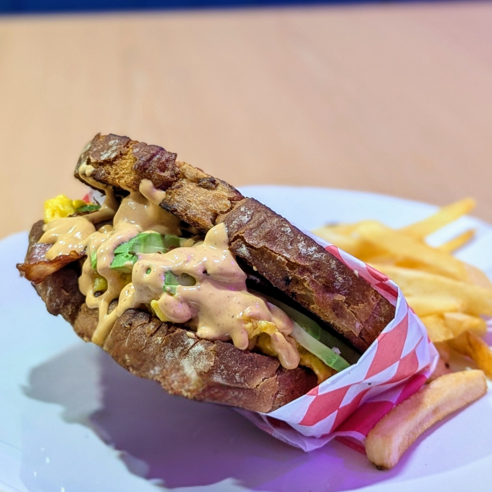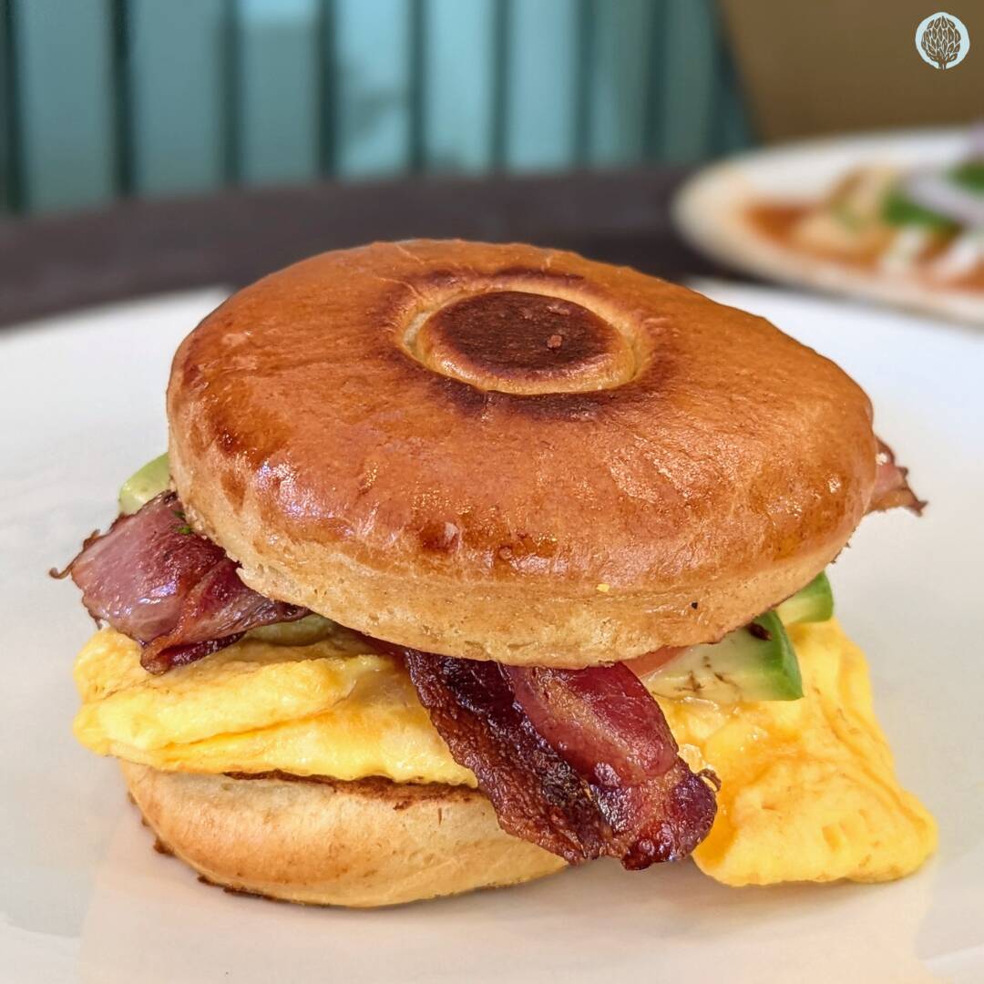 Con huevo, queso, tocino y aguacate bañado en crema de chipotle.