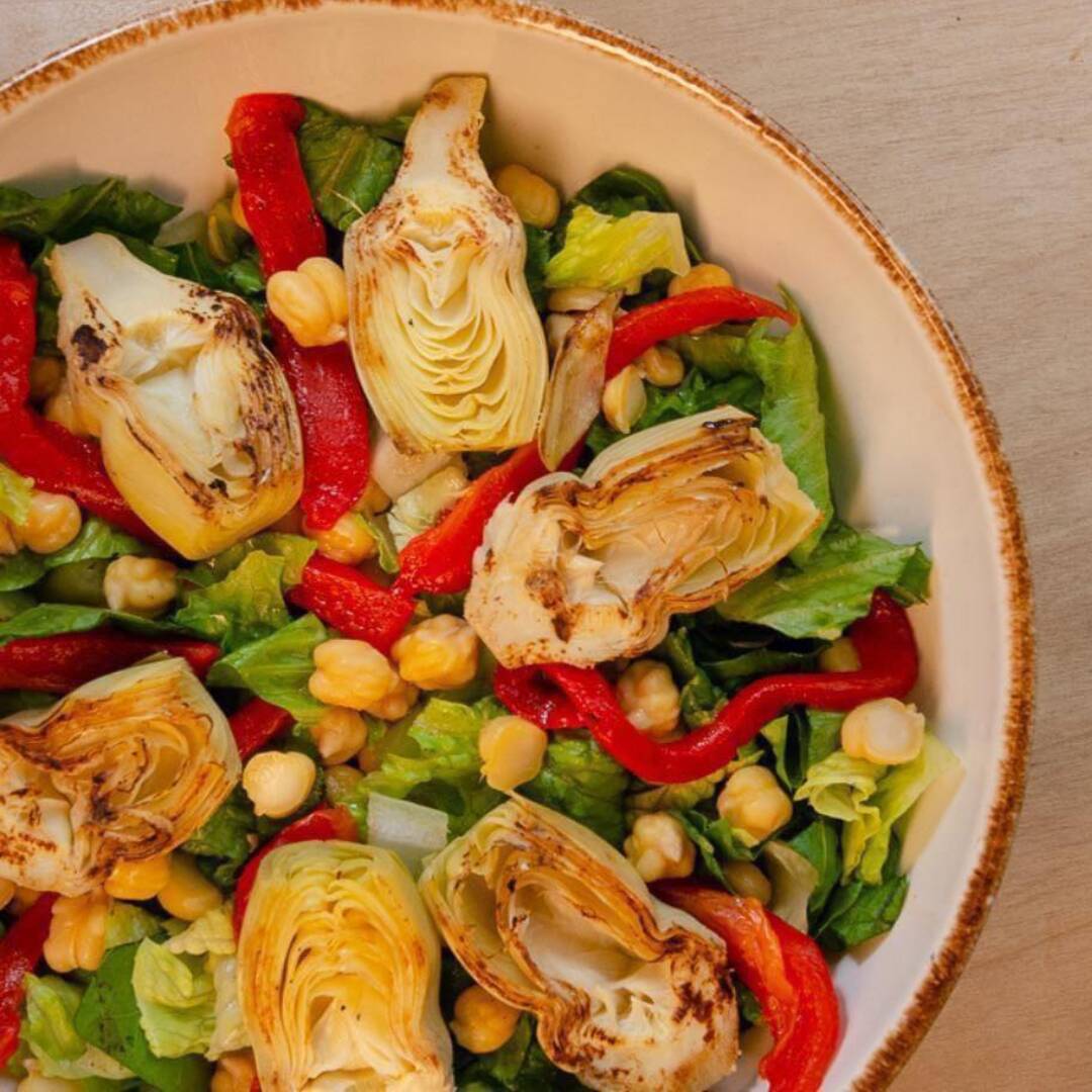 Ensalada de lechuga con pimientos asados, garbanzos y corazones de alcachofa asados, aderezados con una vinagreta de hierbas finas.