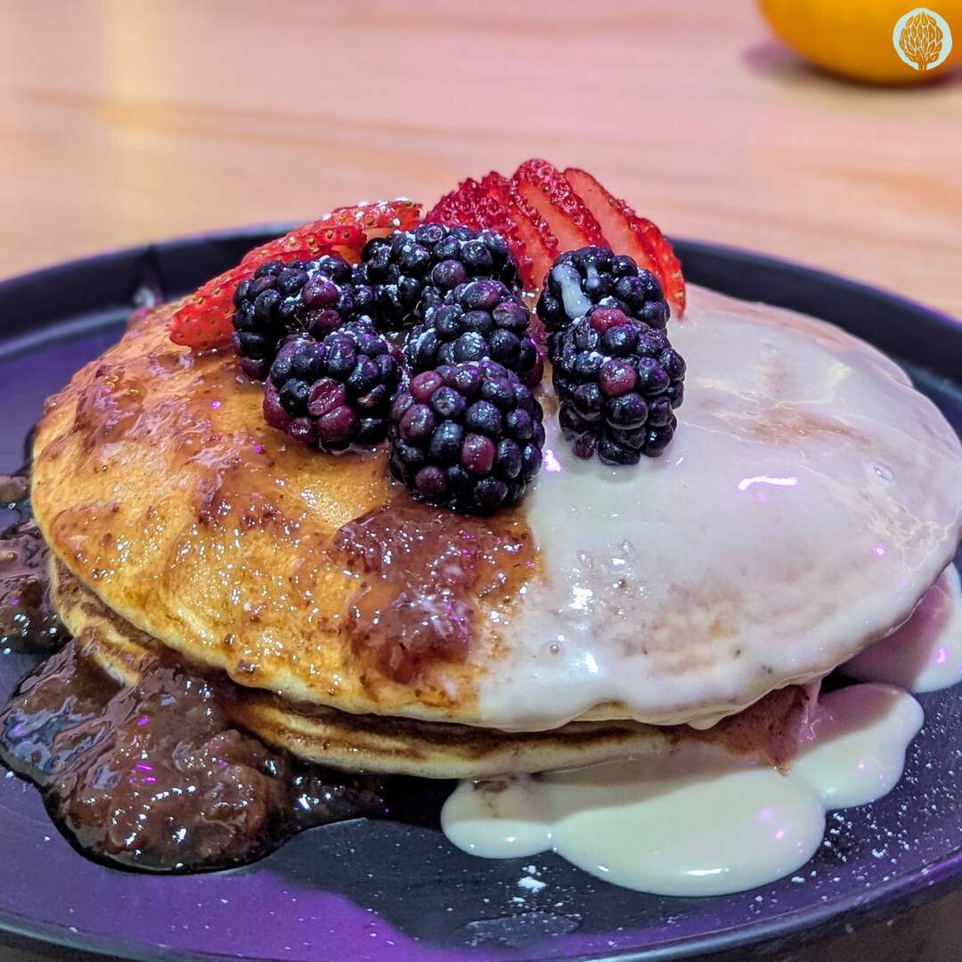 Tres esponjosos hot cakes bañados con mermelada de frutos rojos.