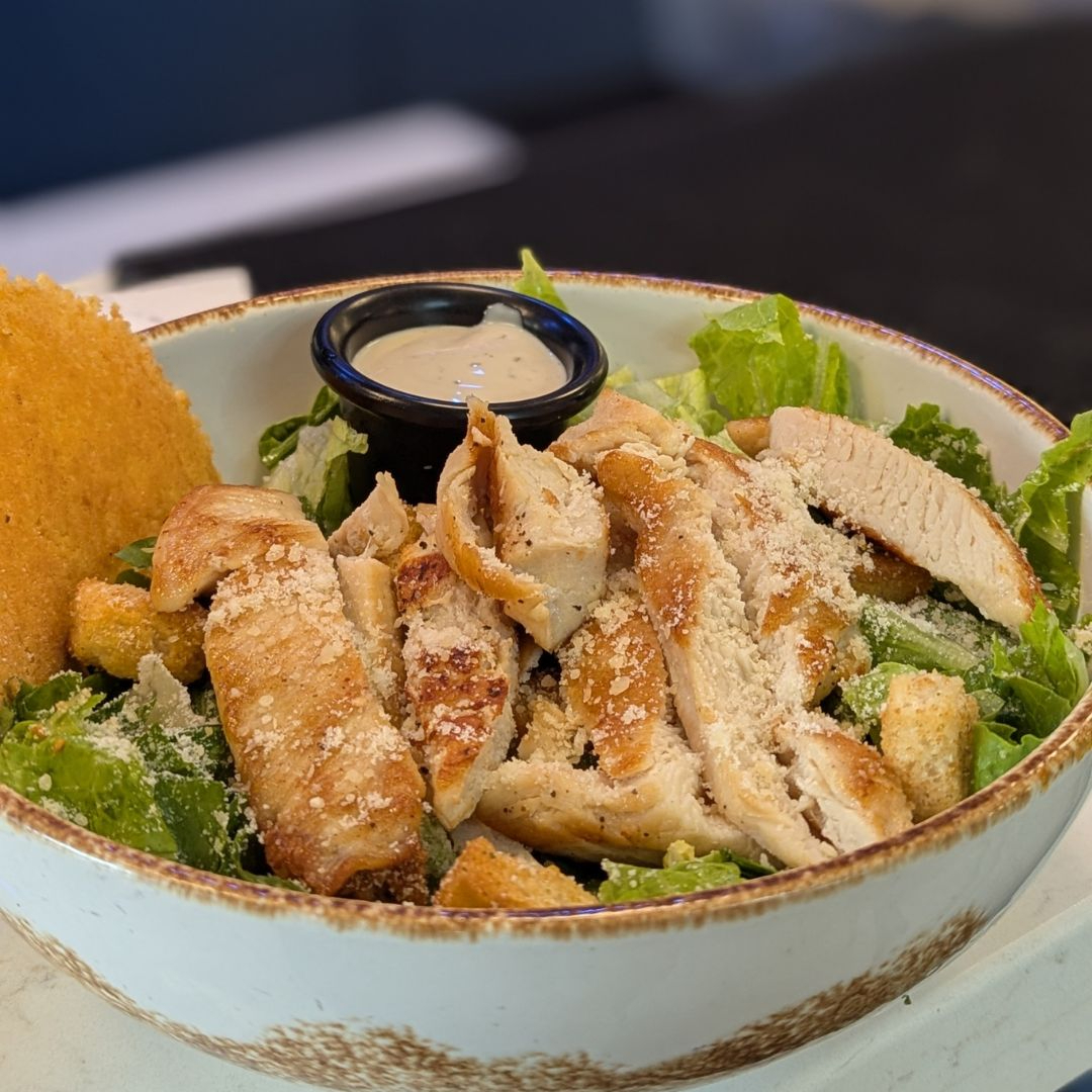 Ensalada de lechuga, crotones, queso parmesano, pechuga de pollo a la plancha y tradicional aderezo cesar.