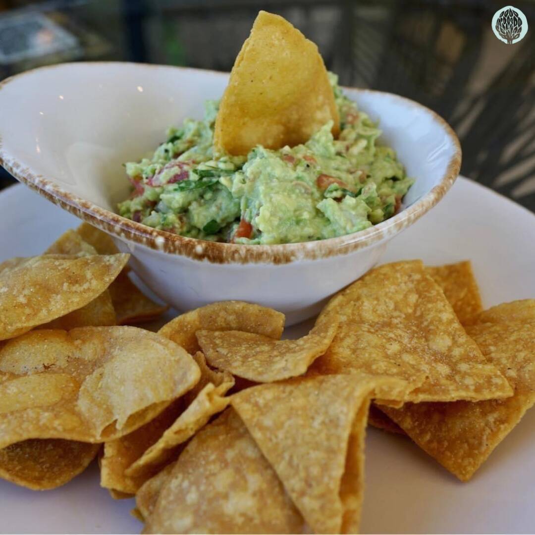 Cremoso aguacate acompañado con pico de gallo y crujientes totopos.