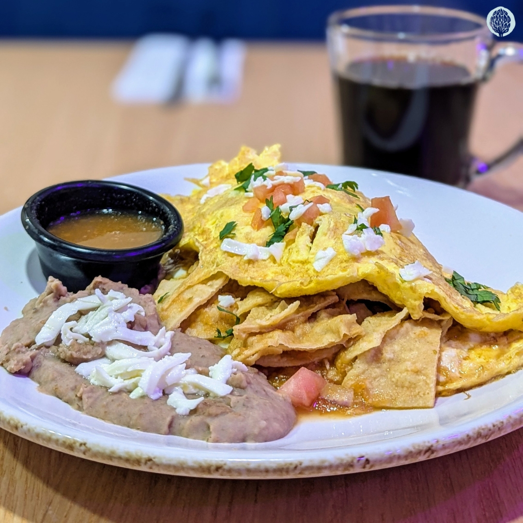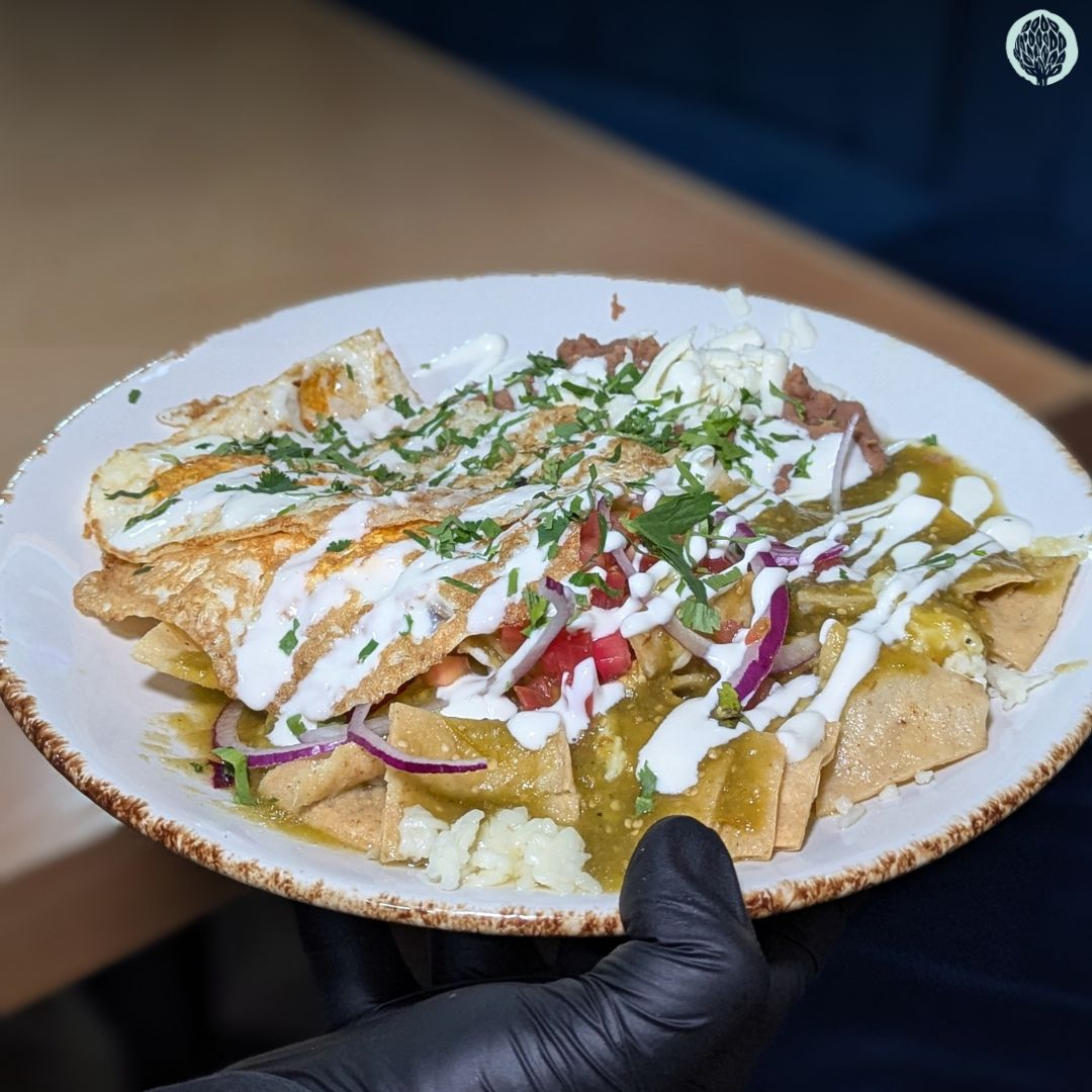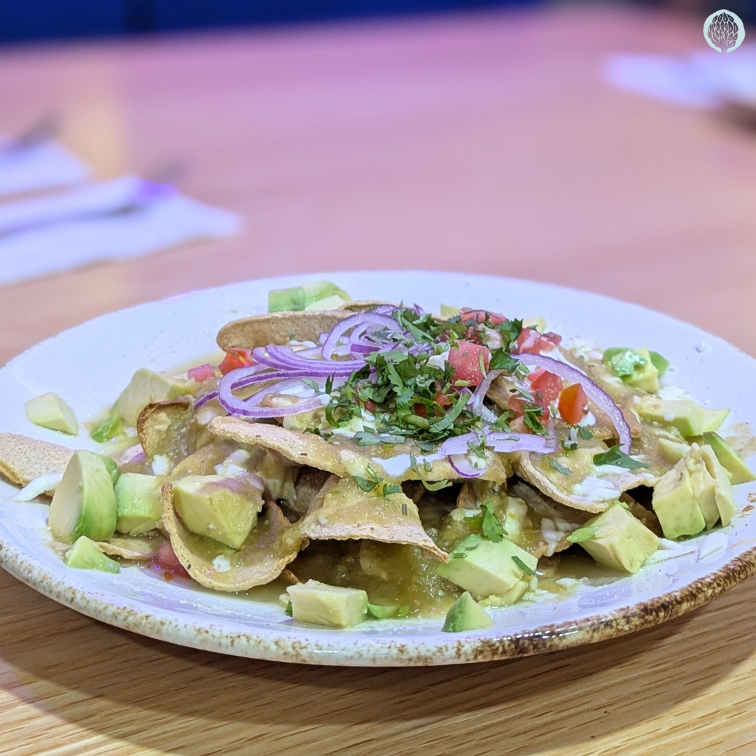 Chips de tortilla bañados en salsa verde, roja, morita, poblana o toluqueña, queso asadero y crema, acompañados de frijoles.