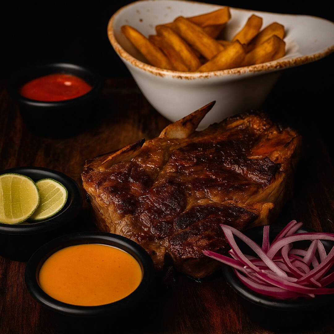Corte de Rib-Eye a termino deseado con un complemento a elegir.