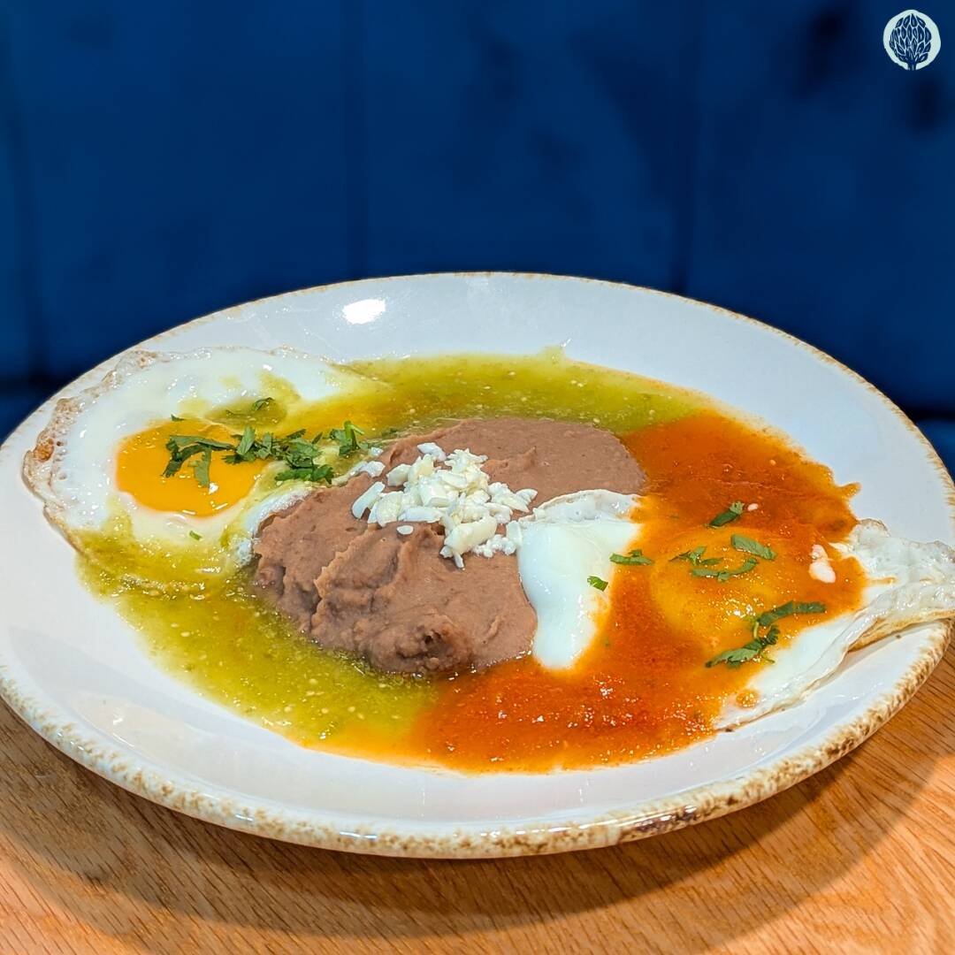 Con dos huevos estrellados en salsa a escoger verde, roja o chipotle, acompañado de frijoles.