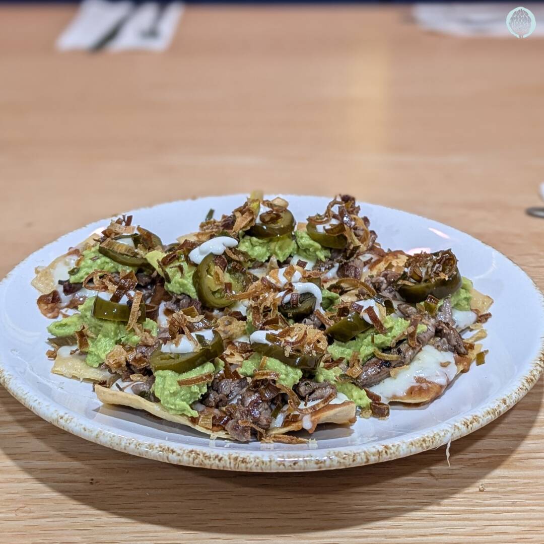 Totopos, queso gratinado, guacamole, frijoles, crema, y chile jalapeño con carne.