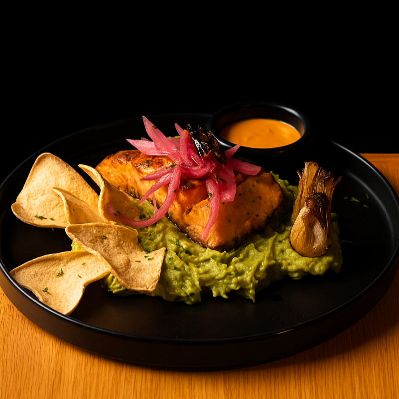 Sentado en una cama de guacamole adornado de cebolla incurtida y dos chiles de árbol.