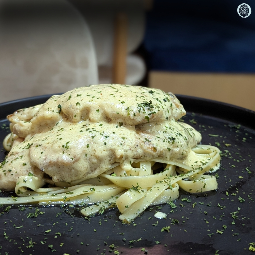 Pechuga de pollo marinada de mostaza con vino blanco, con crema alfredo sentada en pasta de Fetuccini a la mantequilla con ajo.