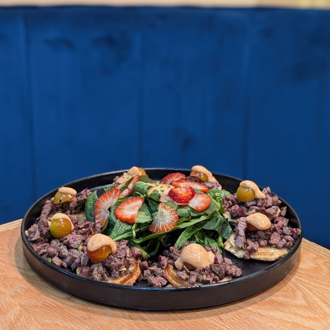 Pan baguette tostado con Rib-Eye coronado con hojas verdes y aliolí de chipotle.
