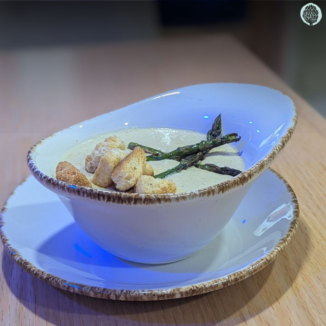 Tazón de crema de alcachofas con esparragos salteados y un toque de la casa.