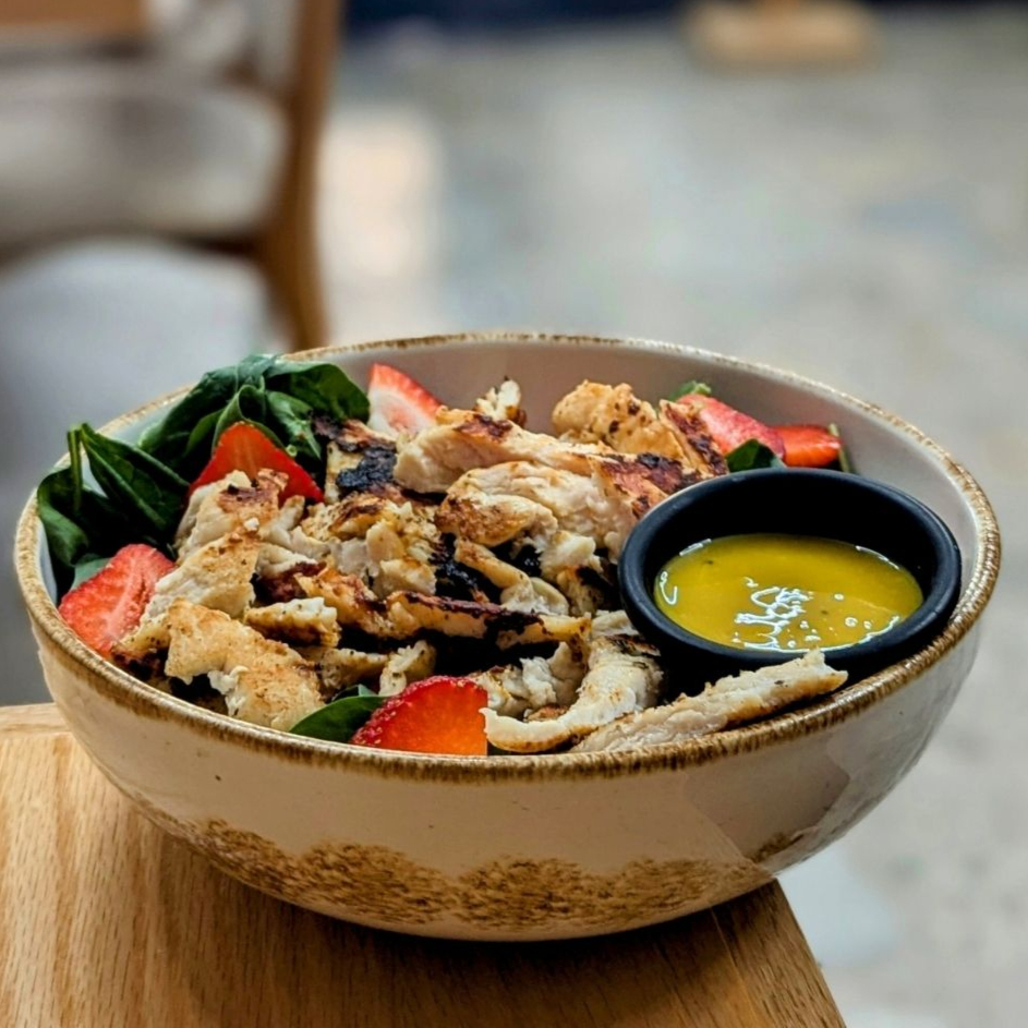 Ensalada de espinacas, nuez, fresa, pollo y aderezo de mostaza dulce.