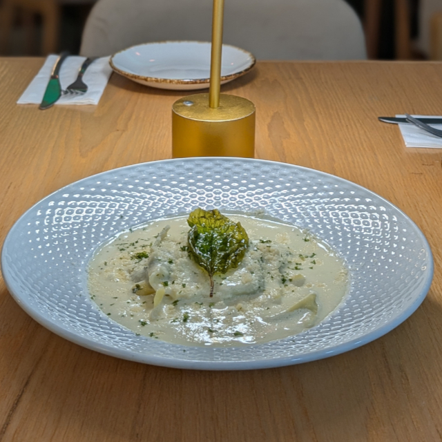 12 piezas de ravioles rellenas de espinaca, brocoli y champiñones, bañada en salsa Alfredo con cebolla y champiñones y salteado al vino blanco.