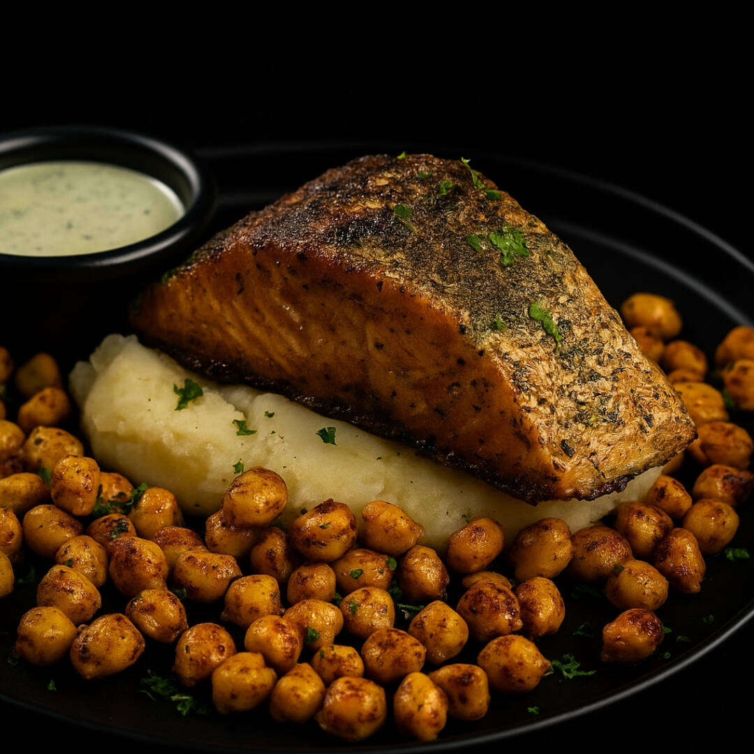 Sentado en cama de puré de papa natural y garbanzo.