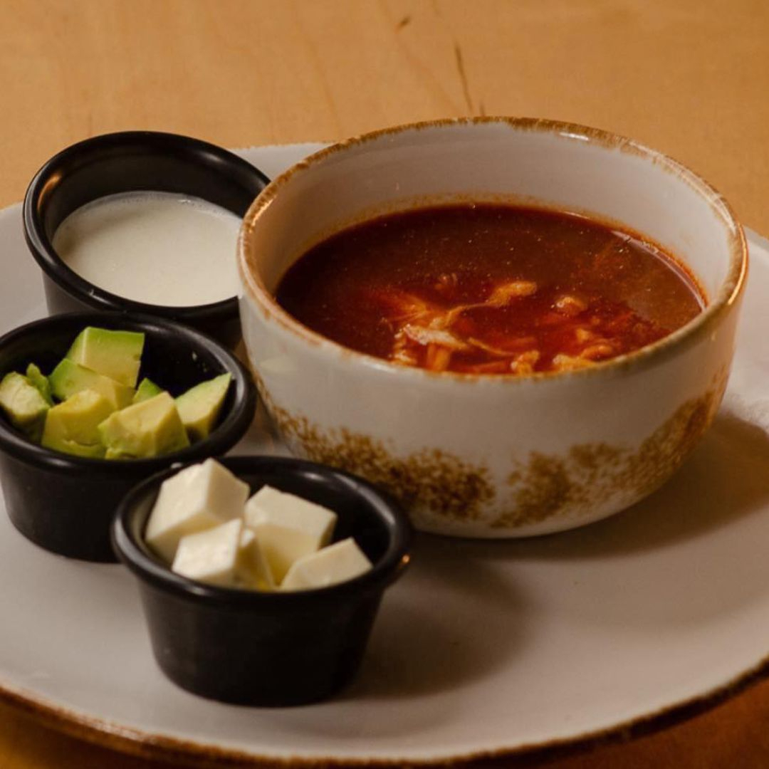 Consome de pollo con garbanzos, pechuga de pollo desmenuzada, chile chipotle, queso panela y aguacate.