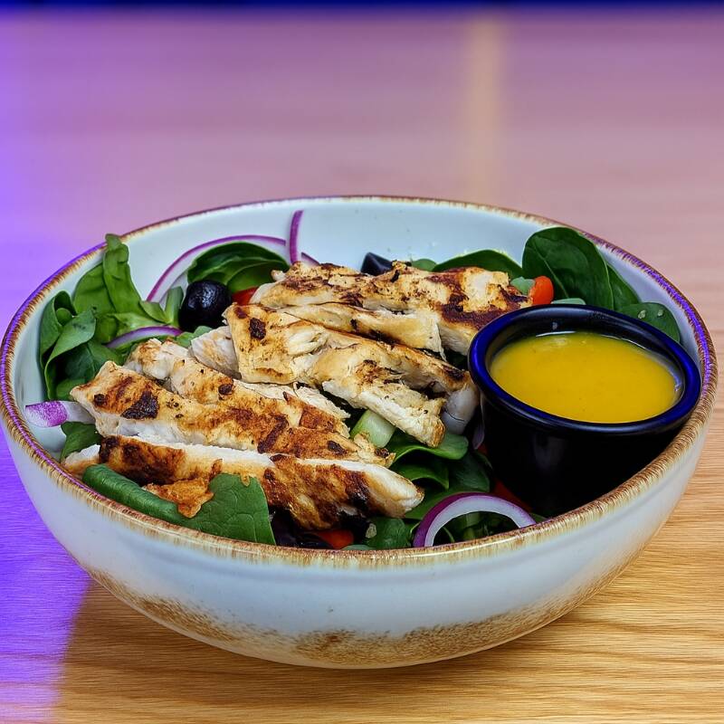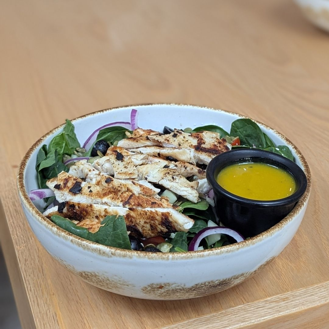 Ensalada de pollo,lechuga, tomates cherry, aceitunas negras, cebolla morada, pechuga de pollo a la plancha y queso panela con aderezo de cilantro.