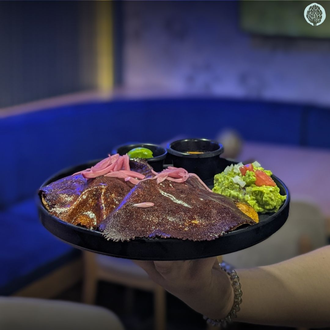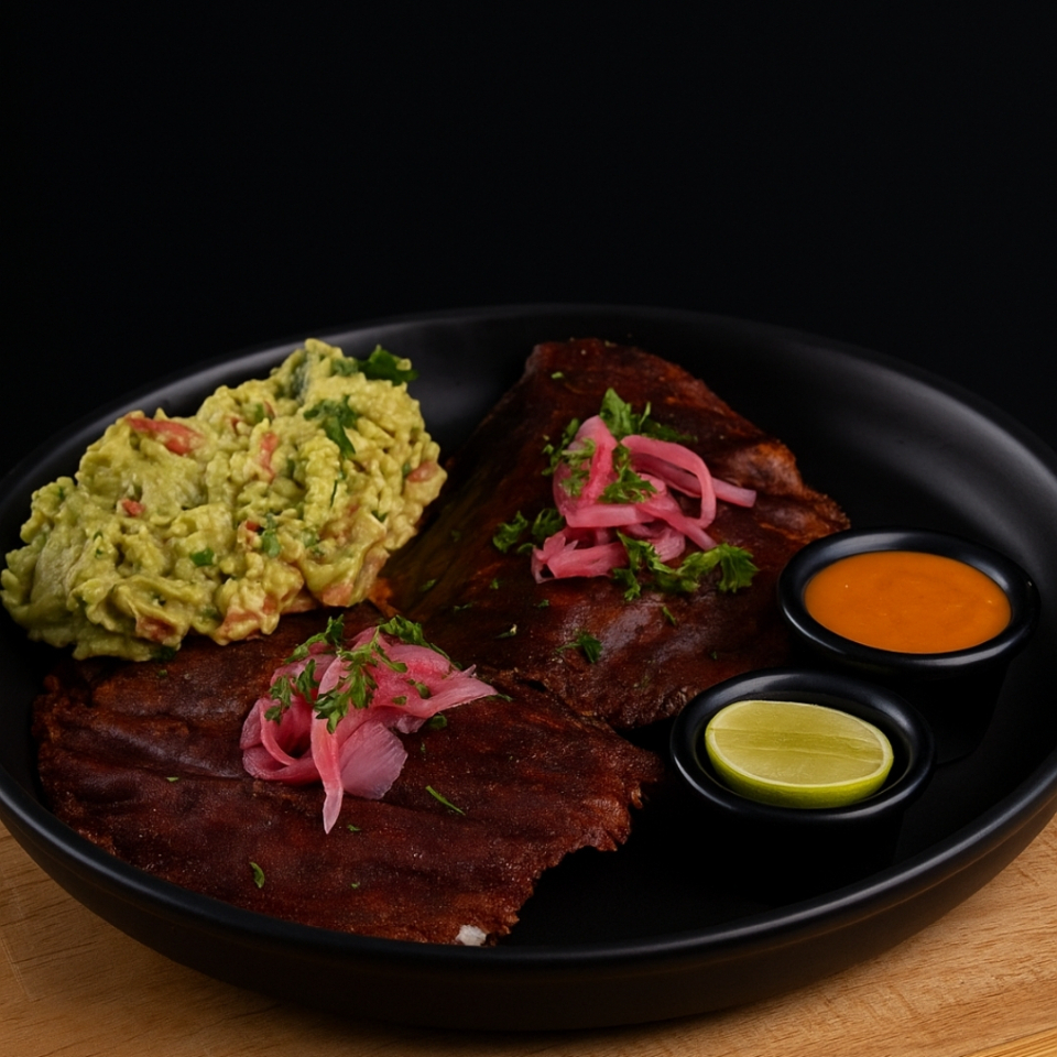 Acompañado de cebolla morada, pepino, chile habanero, poro y aguacate. Con salsa verde o salsa negra.