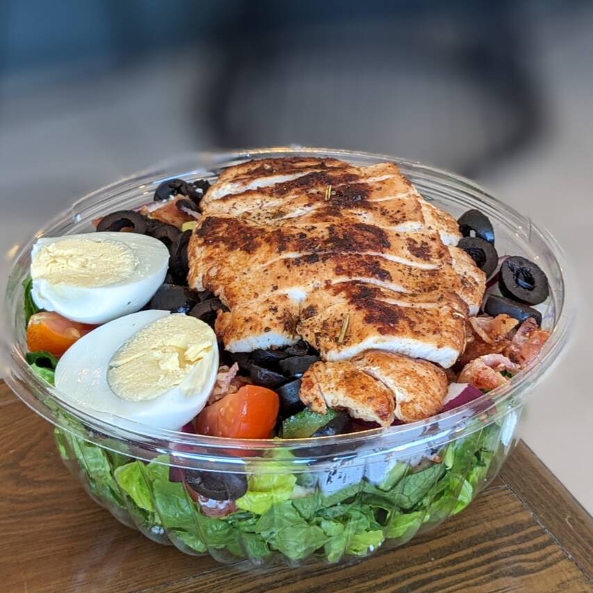 Ensalada de lechuga, tocino, aguacate, pollo, queso feta, tomate cherry, aderezo ranch y huevo duro.