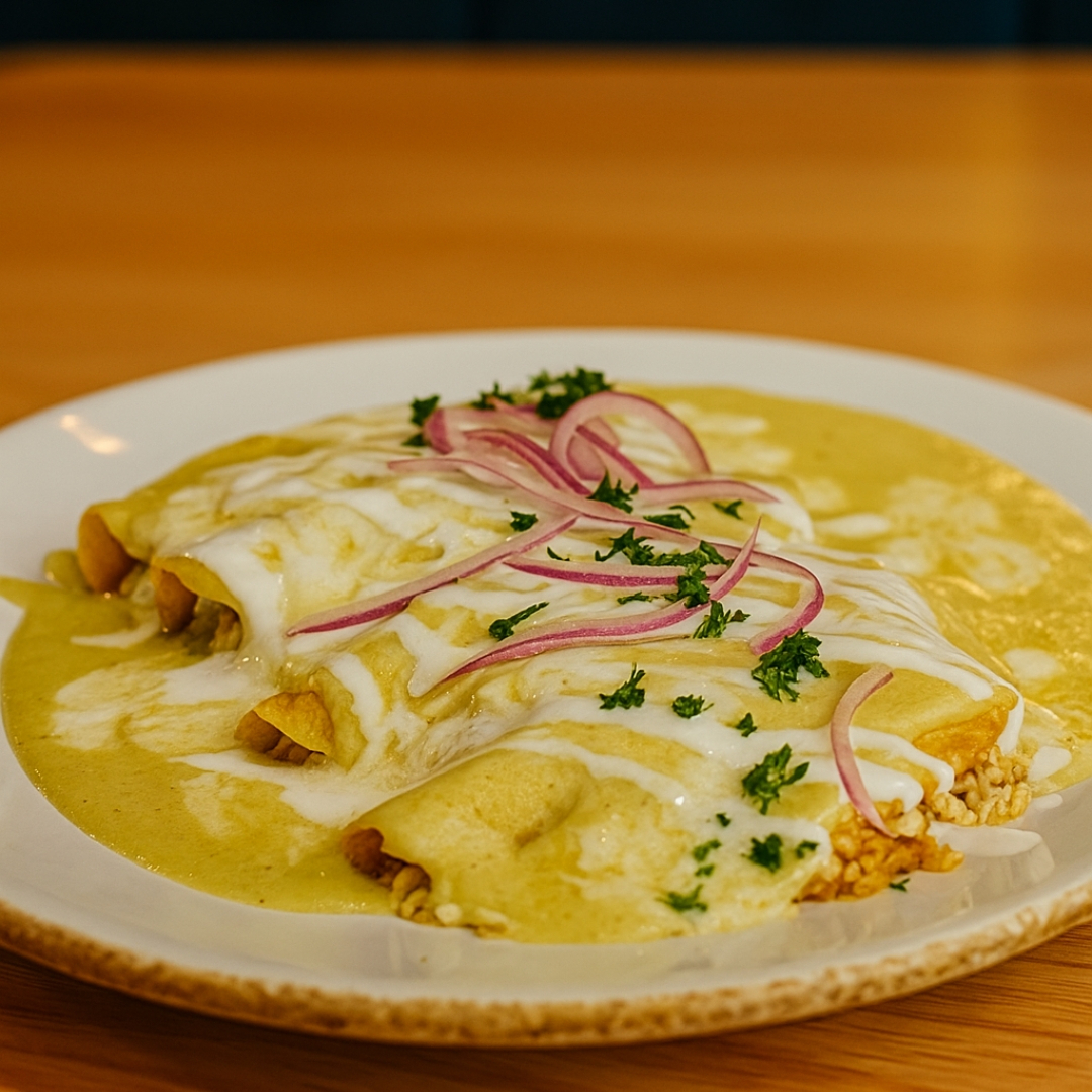 Cuatro enchiladas de pechuga de pollo gratinadas de queso asadero, bañadas en salsa de tomatillo, adornadas con cebolla morada.