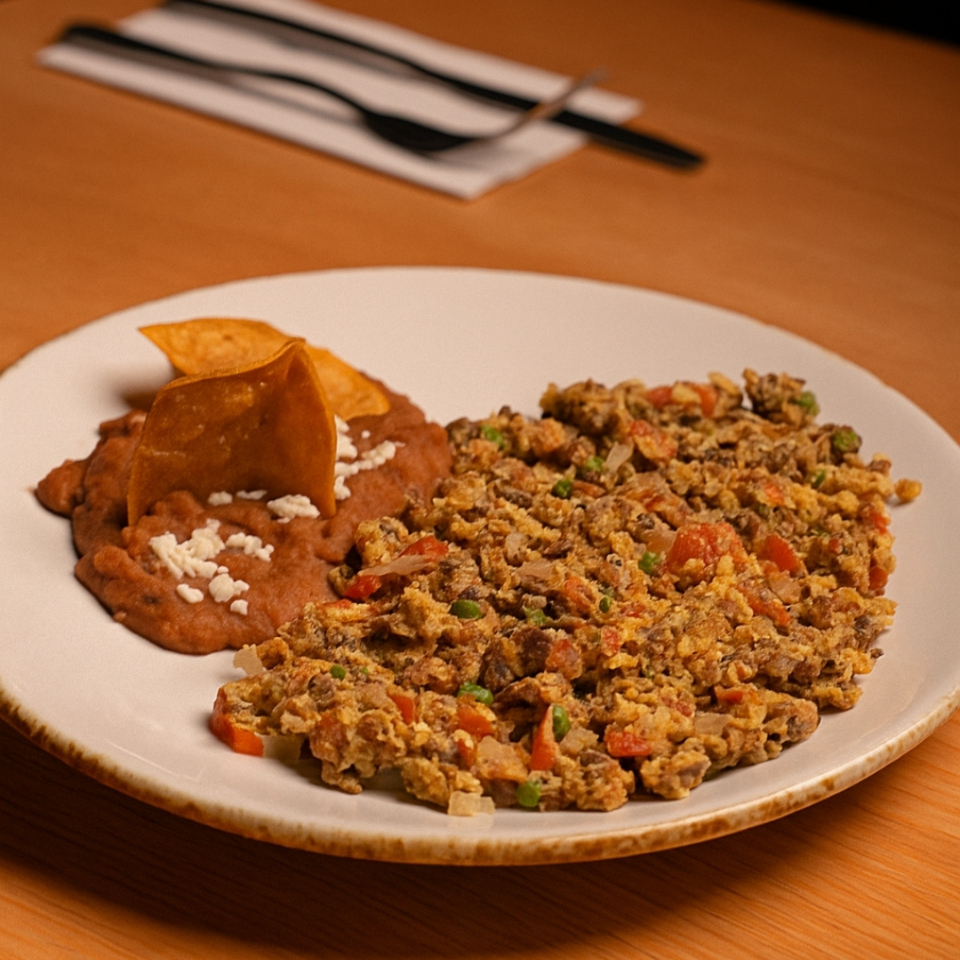 Machacado al gusto con claras, acompañado de rodajas de aguacate.