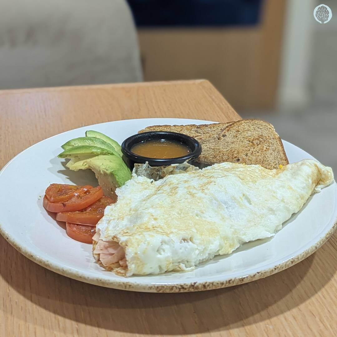 Con una proteína (tocino o jamón) sazonado con tomate y cebolla con queso asadero y dos vegetales a escoger (pimiento, espinacas, champiñones y chile) acompañados de frijoles.