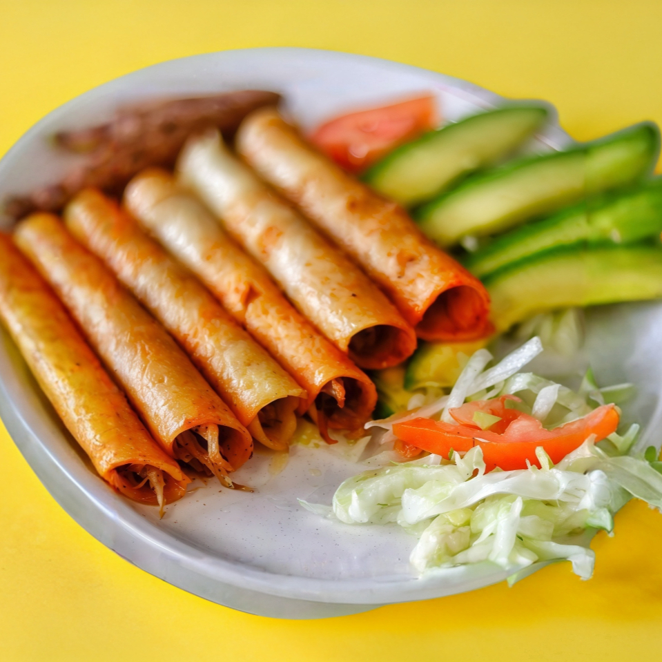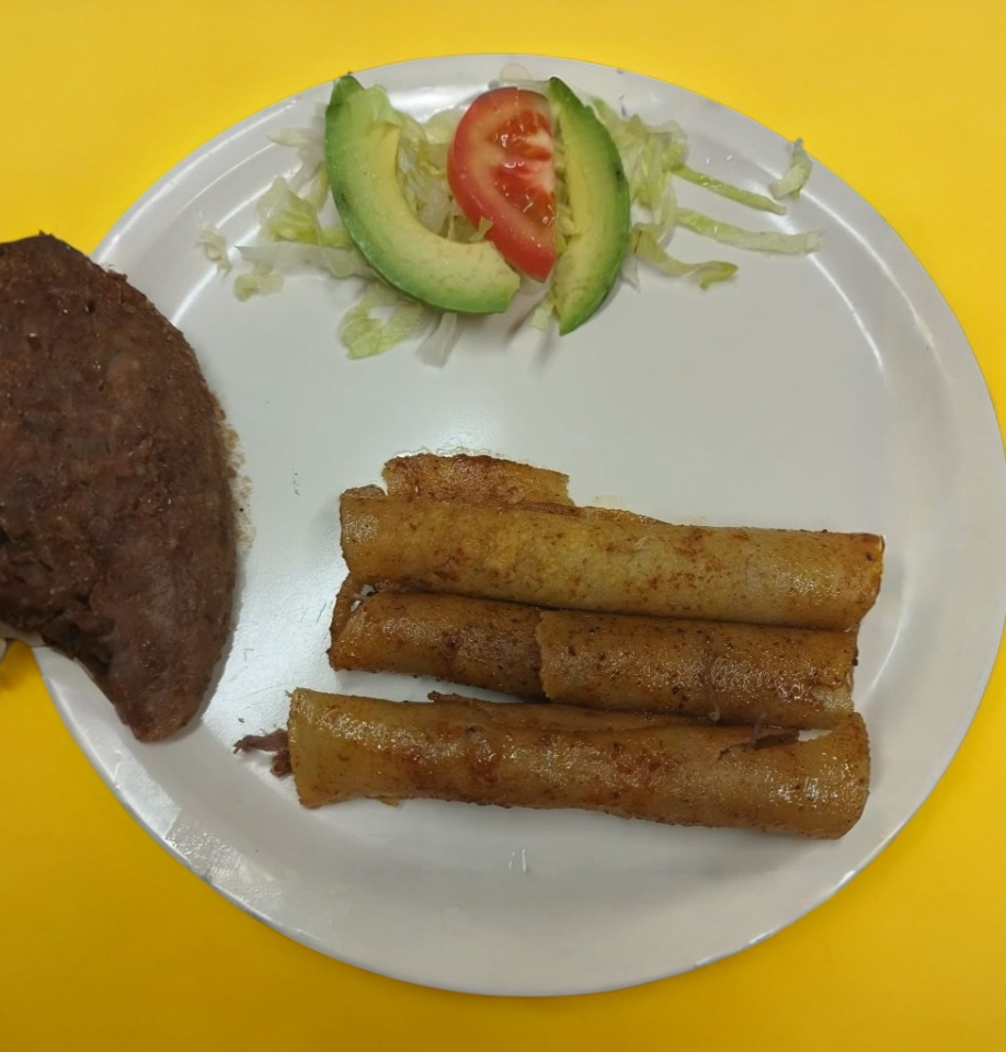6 tacos acompañados de una guarnición de ensalada, frijoles y aguacate.