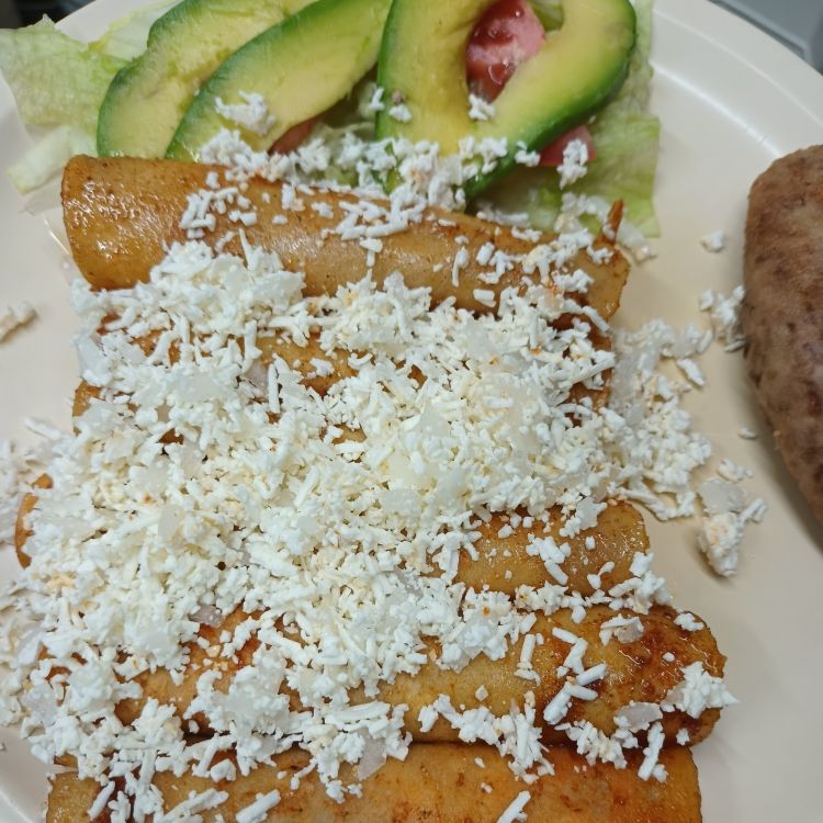 6 enchiladas de queso con cebolla y guarnición de ensalada y frijoles refritos