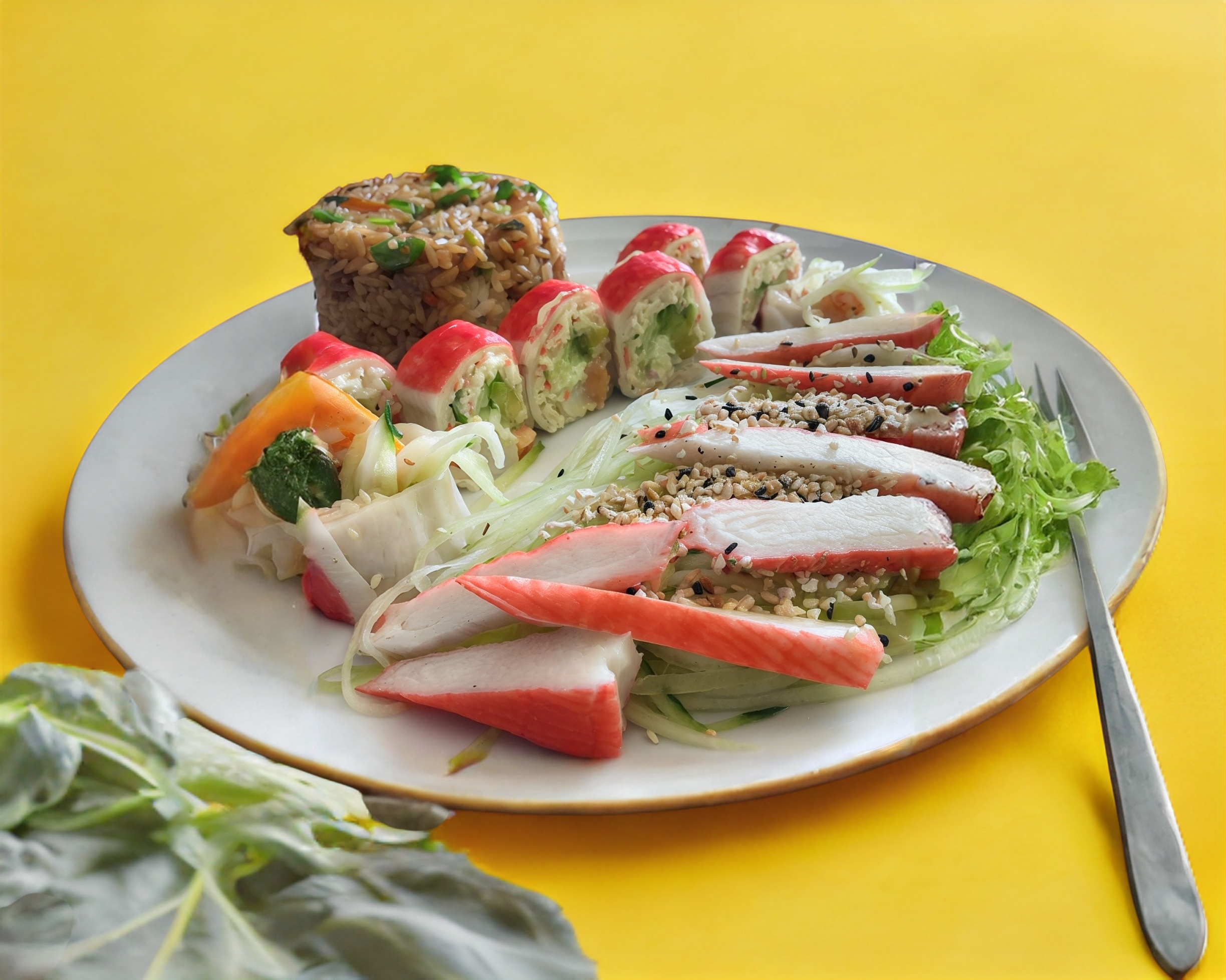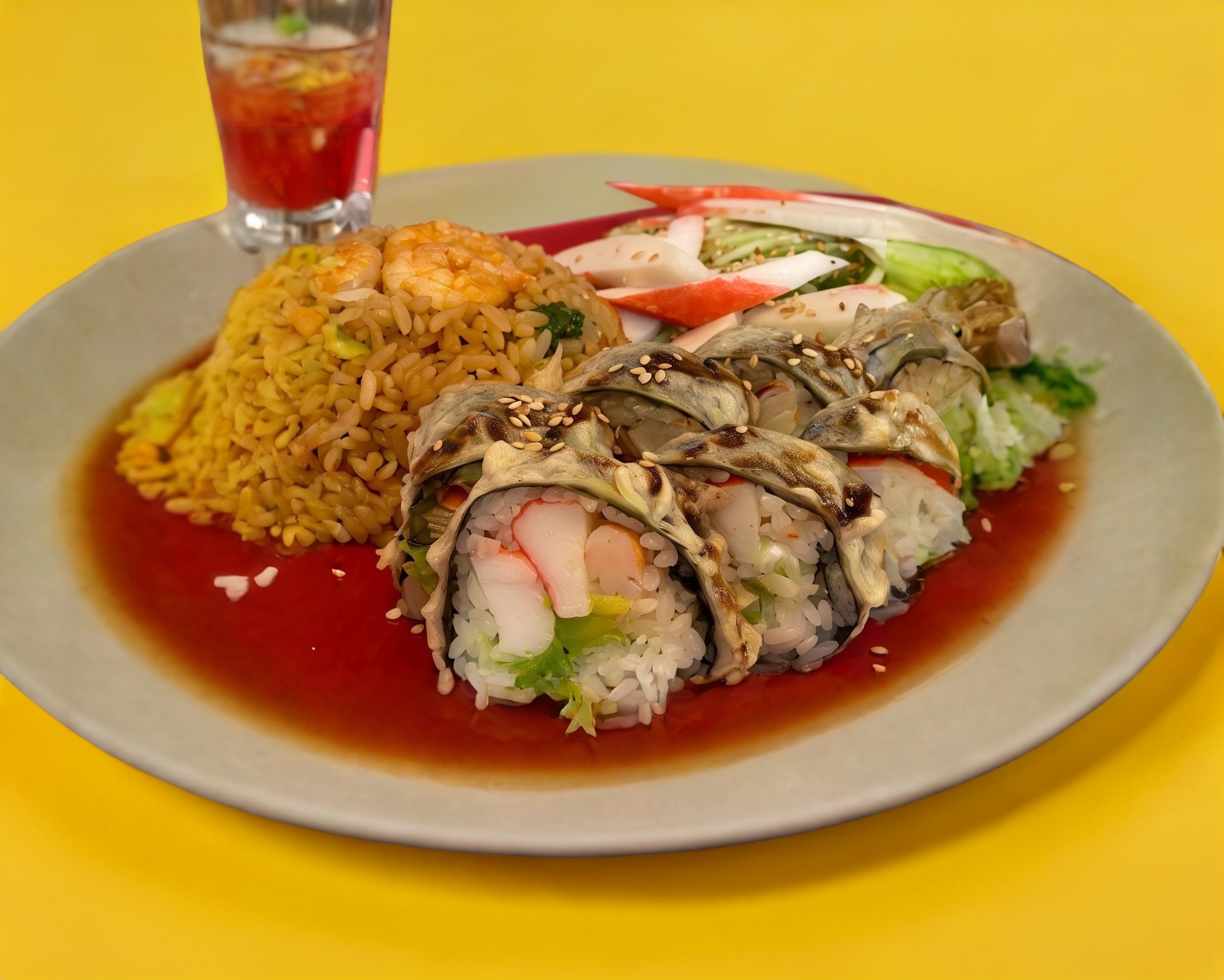 1 rollo a escoger, 1/2 ensalada de cangrejo y 1/2 arroz mixto