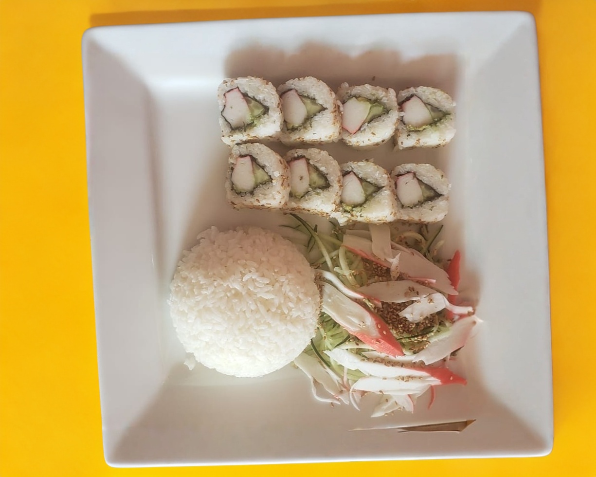 1 california roll, 1/2 arroz de pollo y 1/2 ensalada de pepino con cangrejo