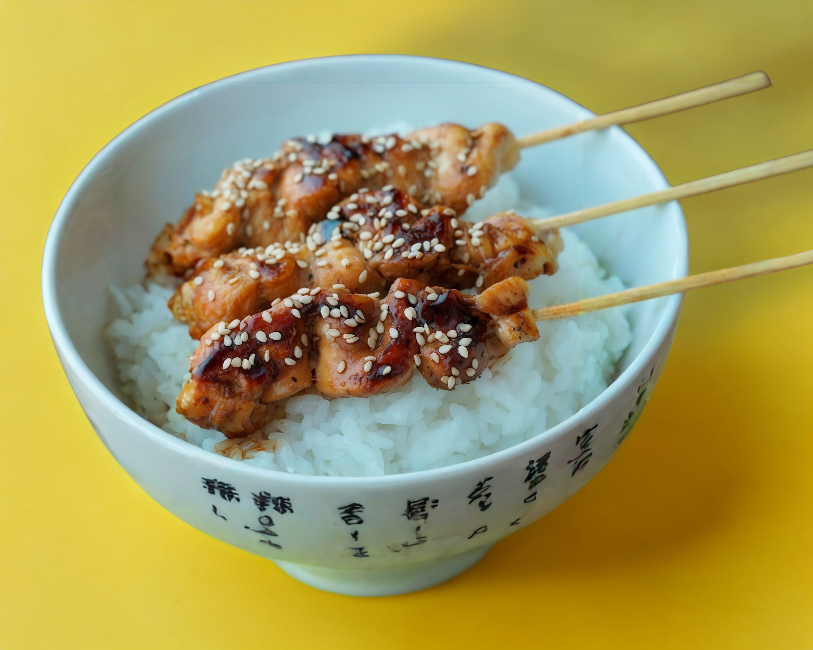 3 brochetas de pollo con cebolla, morrón y acompañado de arroz y salsa de la casa