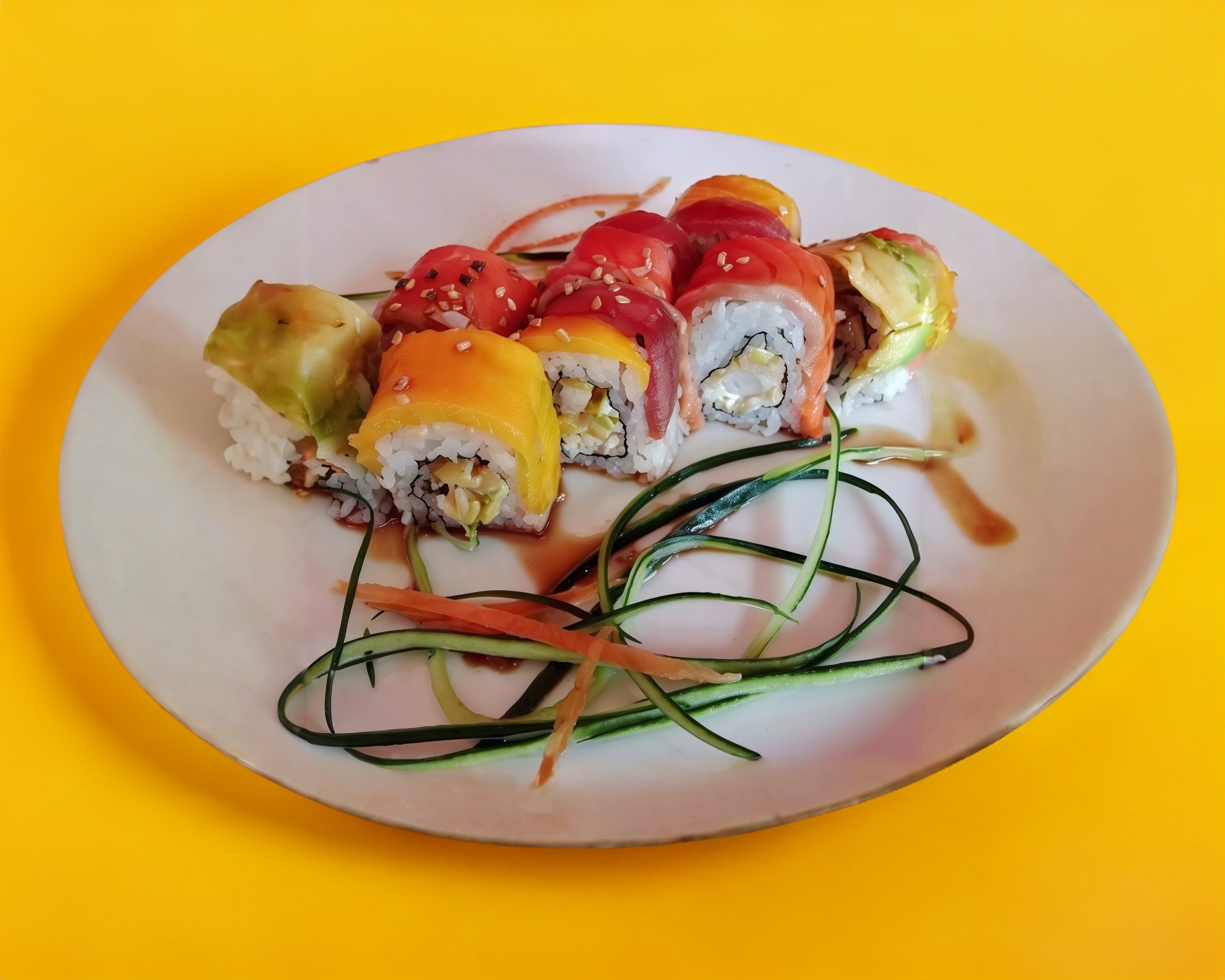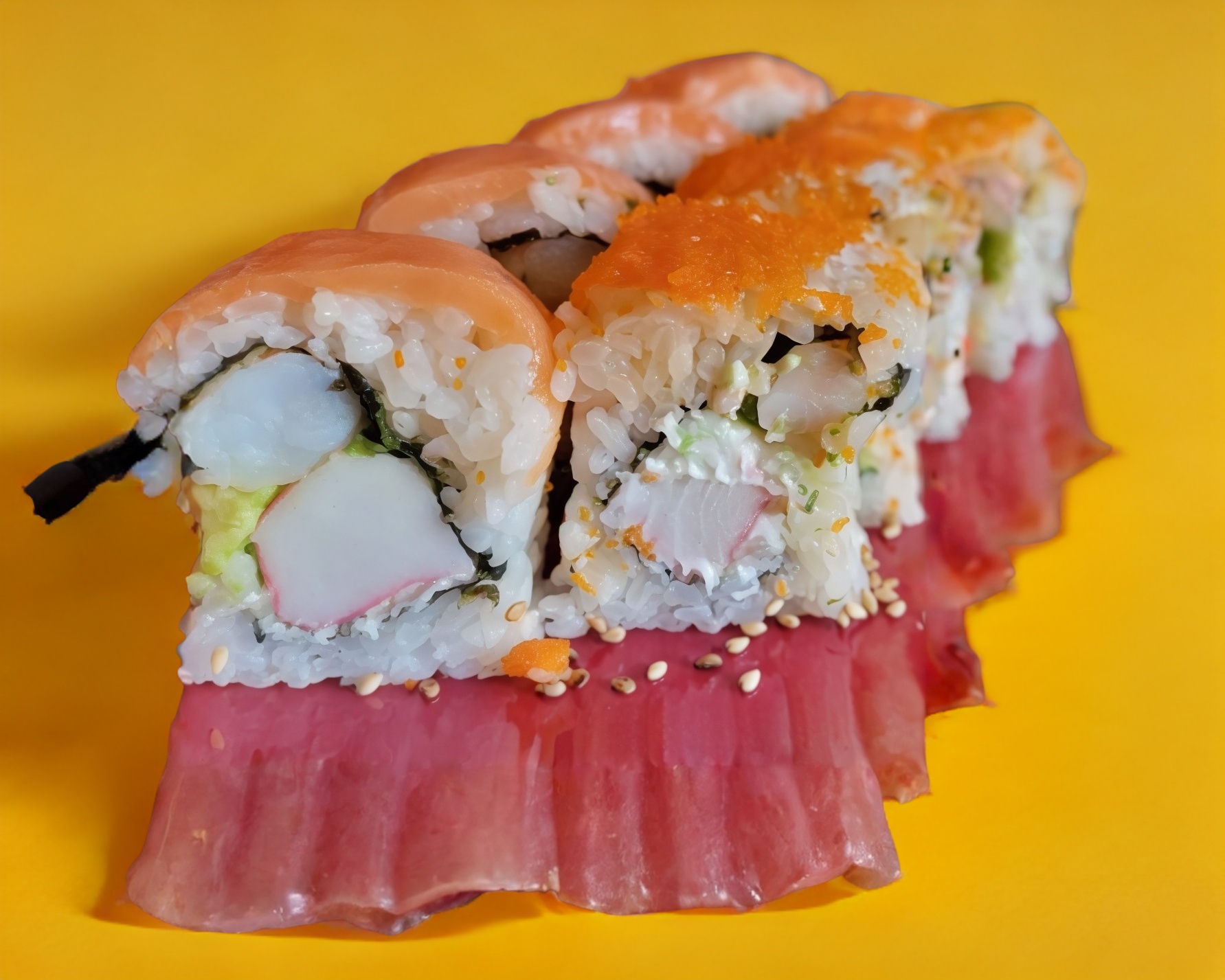 Queso crema, aguacate, camarón empanizado, envuelto en salmón, tuna, aguacate y mango