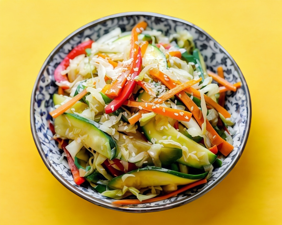 Pepino rallado, camarón, cangrejo, pulpo y ajonjolí