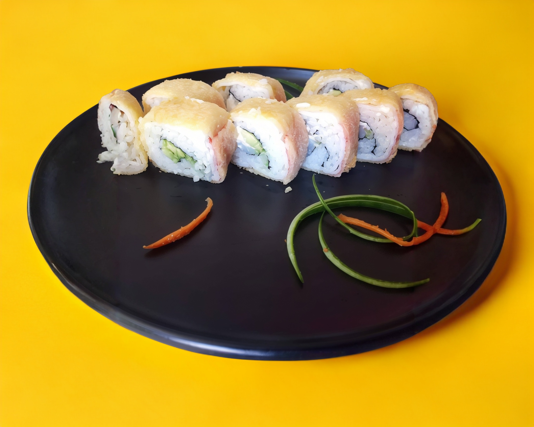 Queso crema, aguacate, pepino, zanahoria envuelto en mango