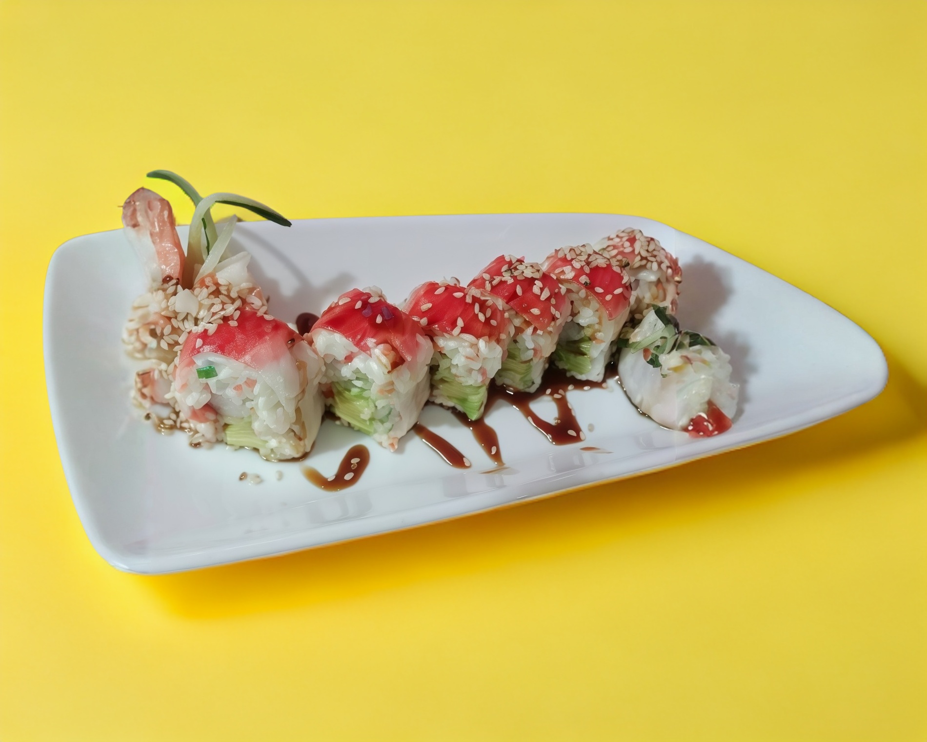 Camarón fresco, queso crema, aguacate, envuelto en surimi y salsa de anguila