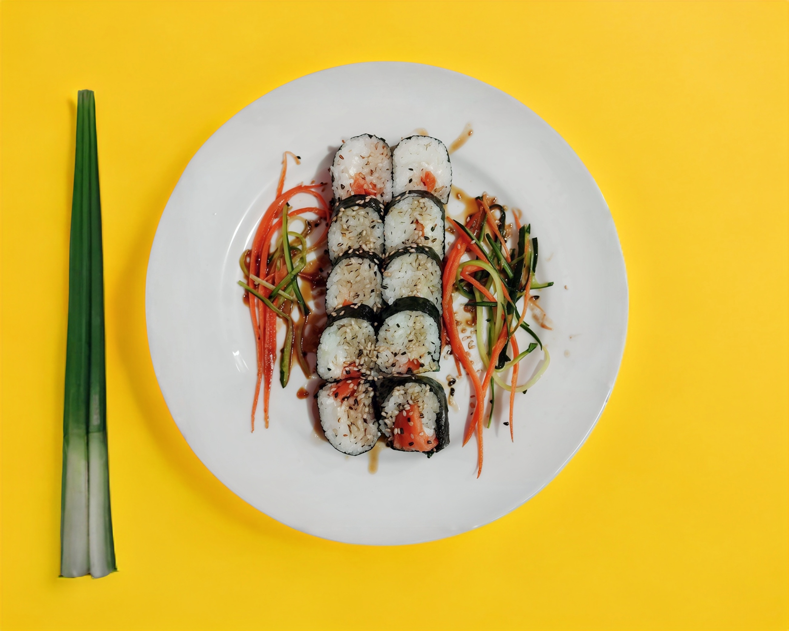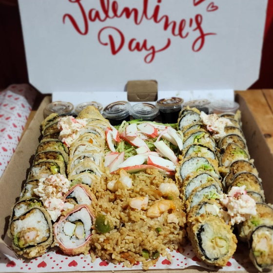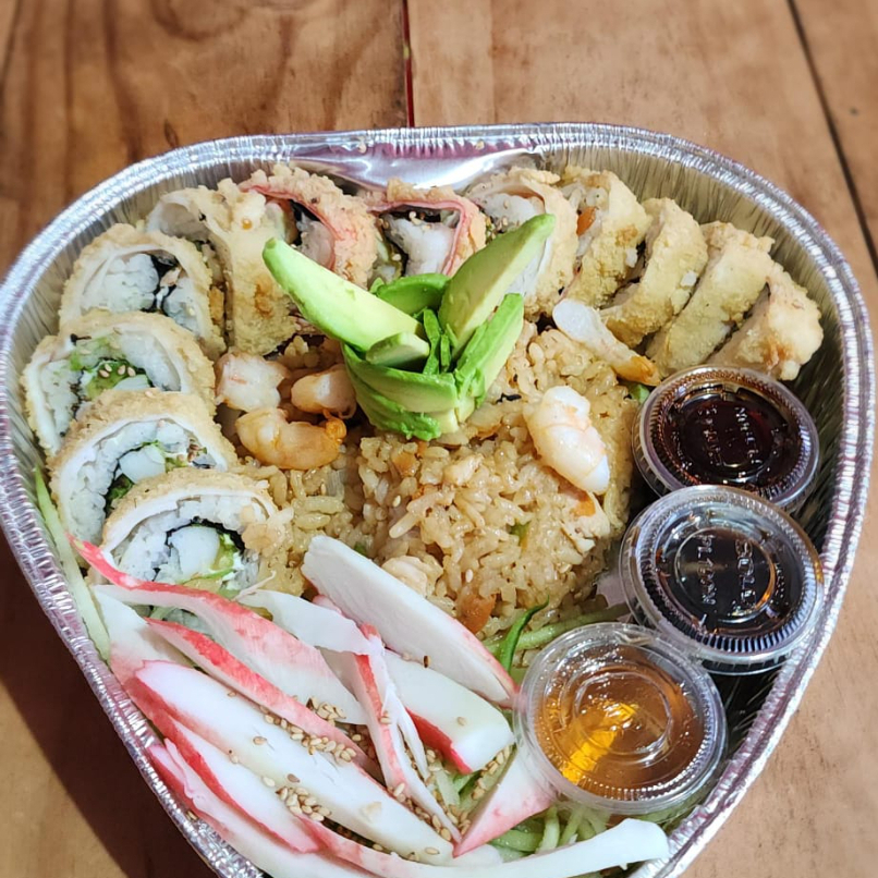 4 rollos a escoger, 1/2 arroz mixto y 1/2 ensalada de cangrejo