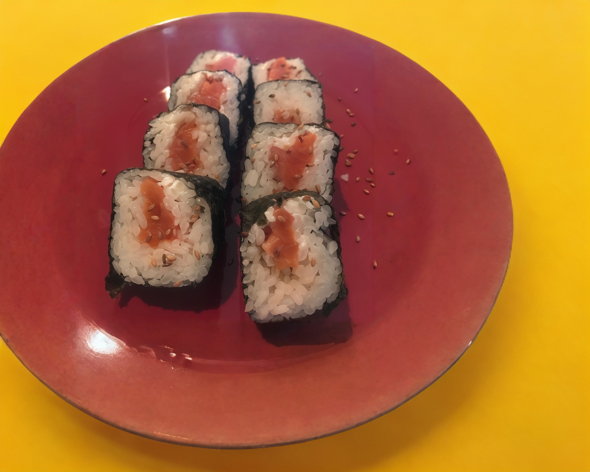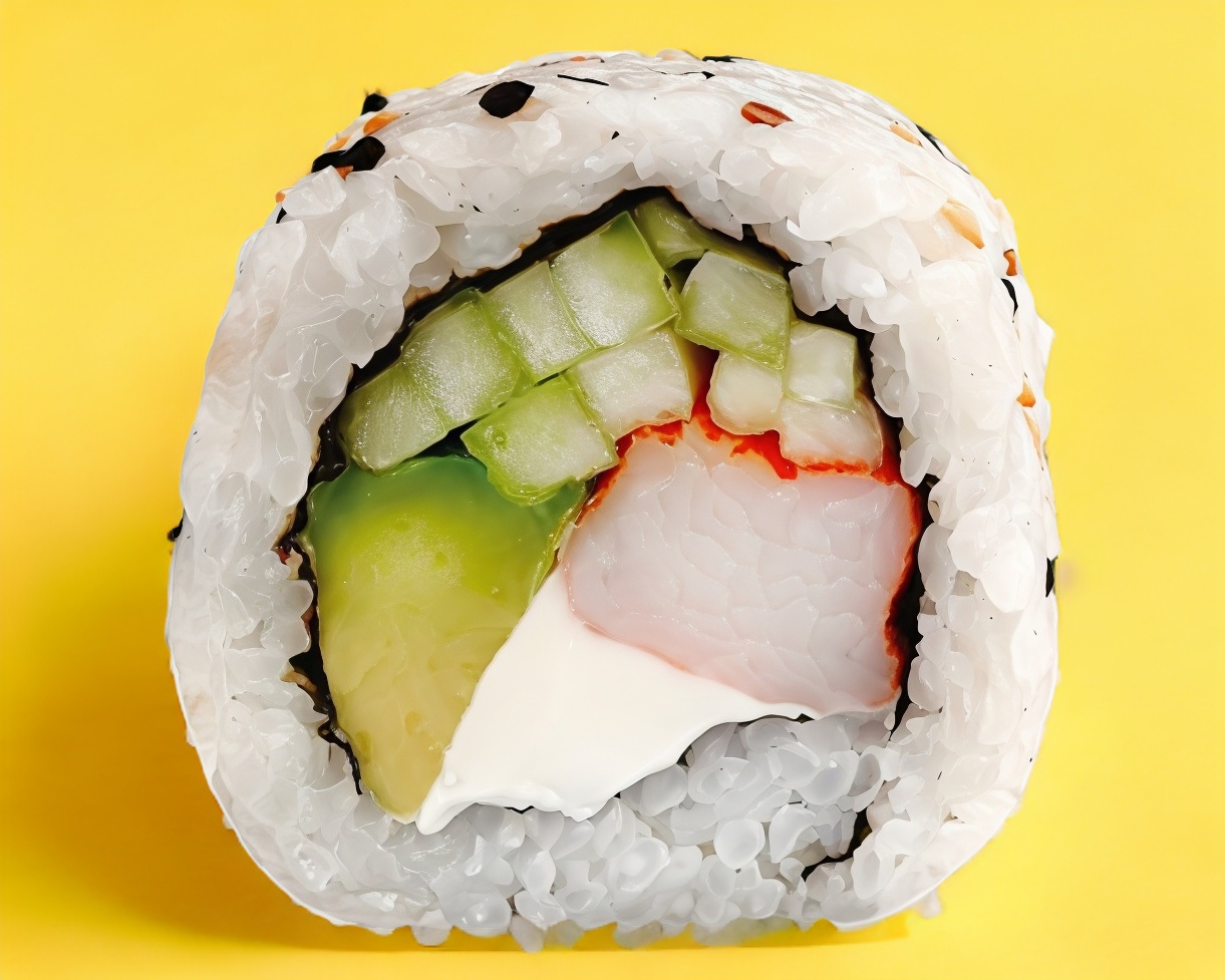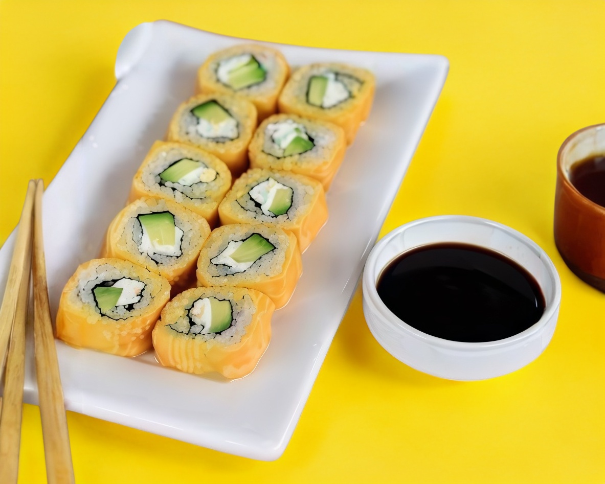 Sin arroz, salmón, camarón fresco, queso crema, aguacate y envuelto en surimi