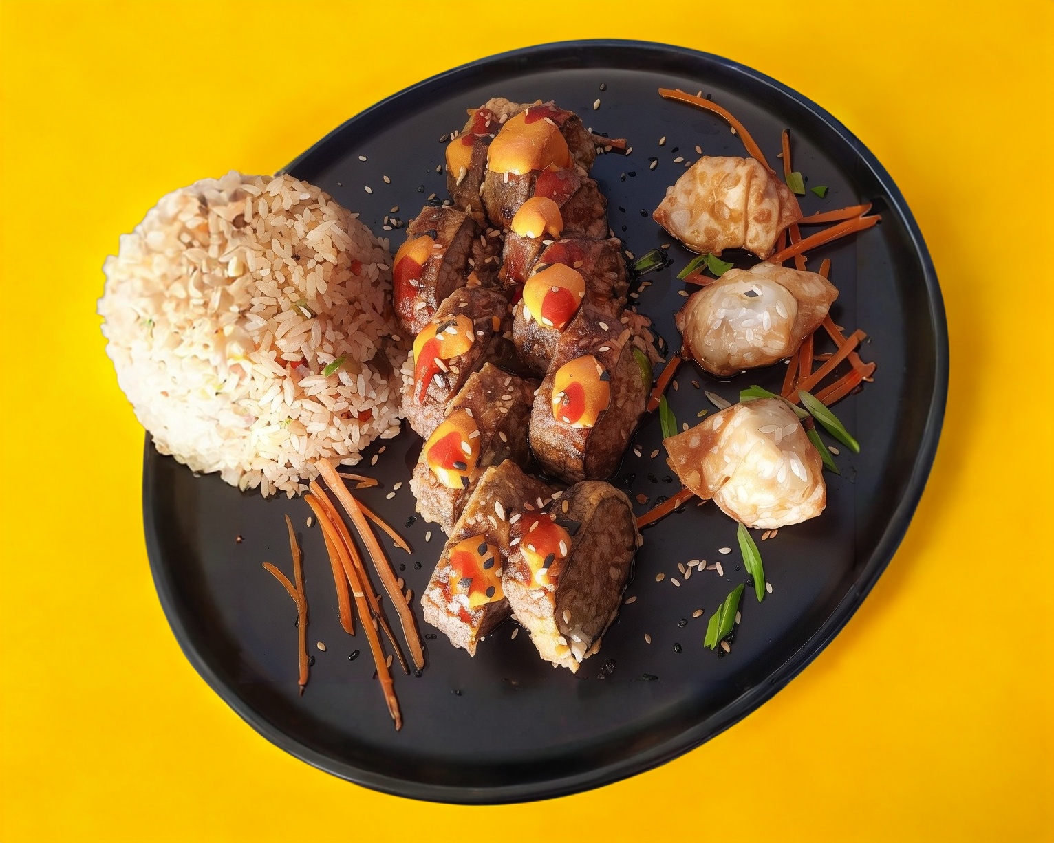 Arroz frito, champiñones, germinados, pollo, carne, camarón, queso crema, aguacate, zanahoria y morrón