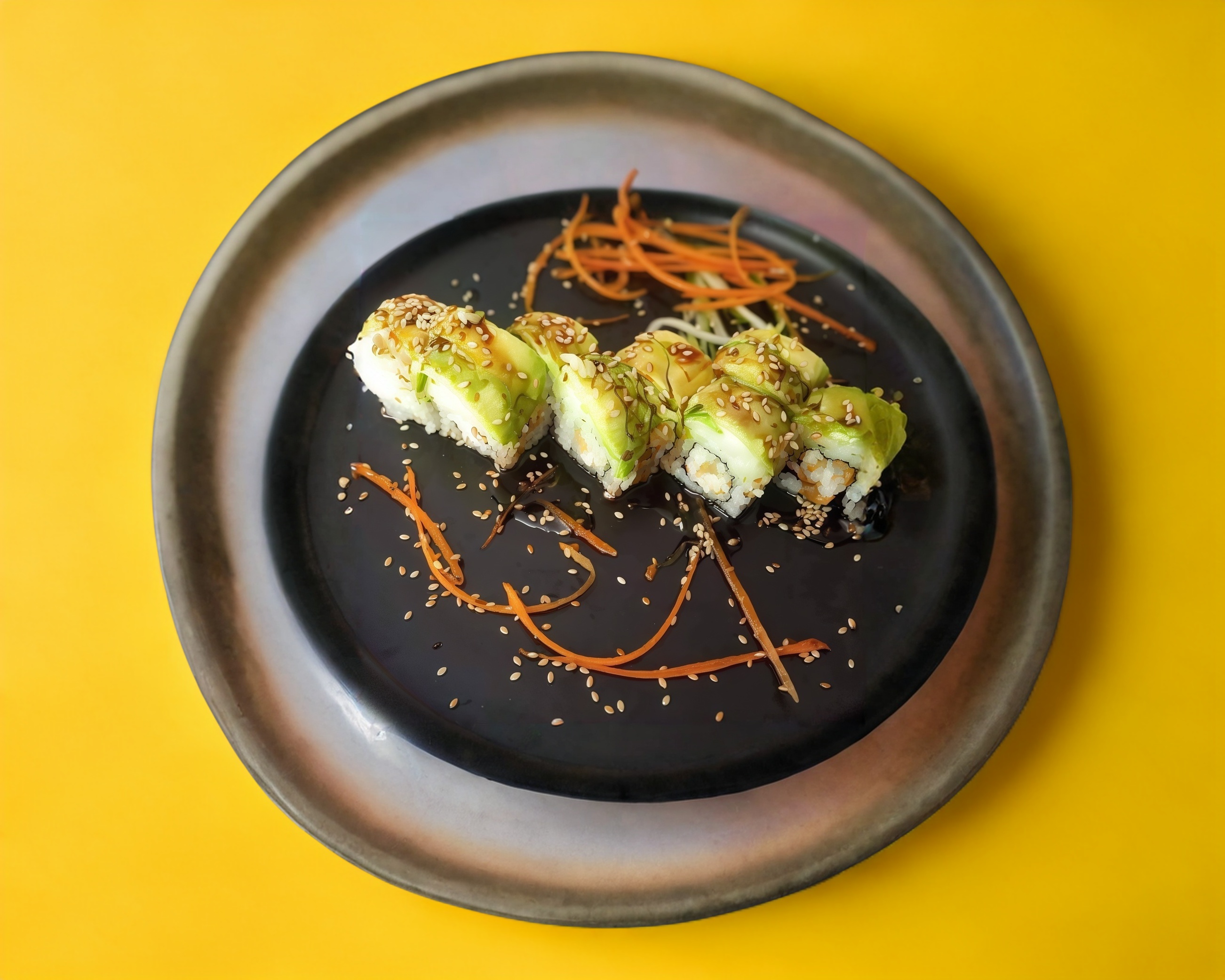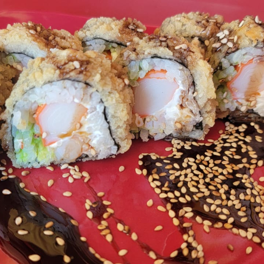Queso crema, aguacate, camarón fresco, envuelto en surimi y salsa de anguila