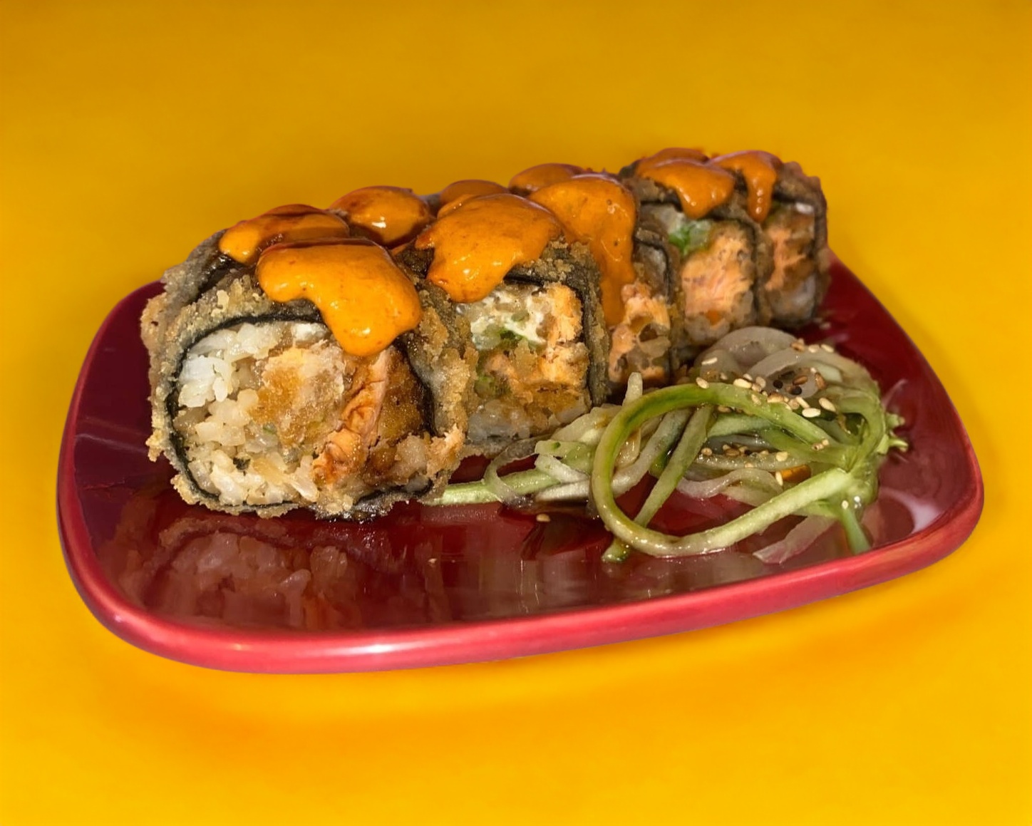 Salmón empanizado, chipotle, queso crema, aguacate y salsa de anguila