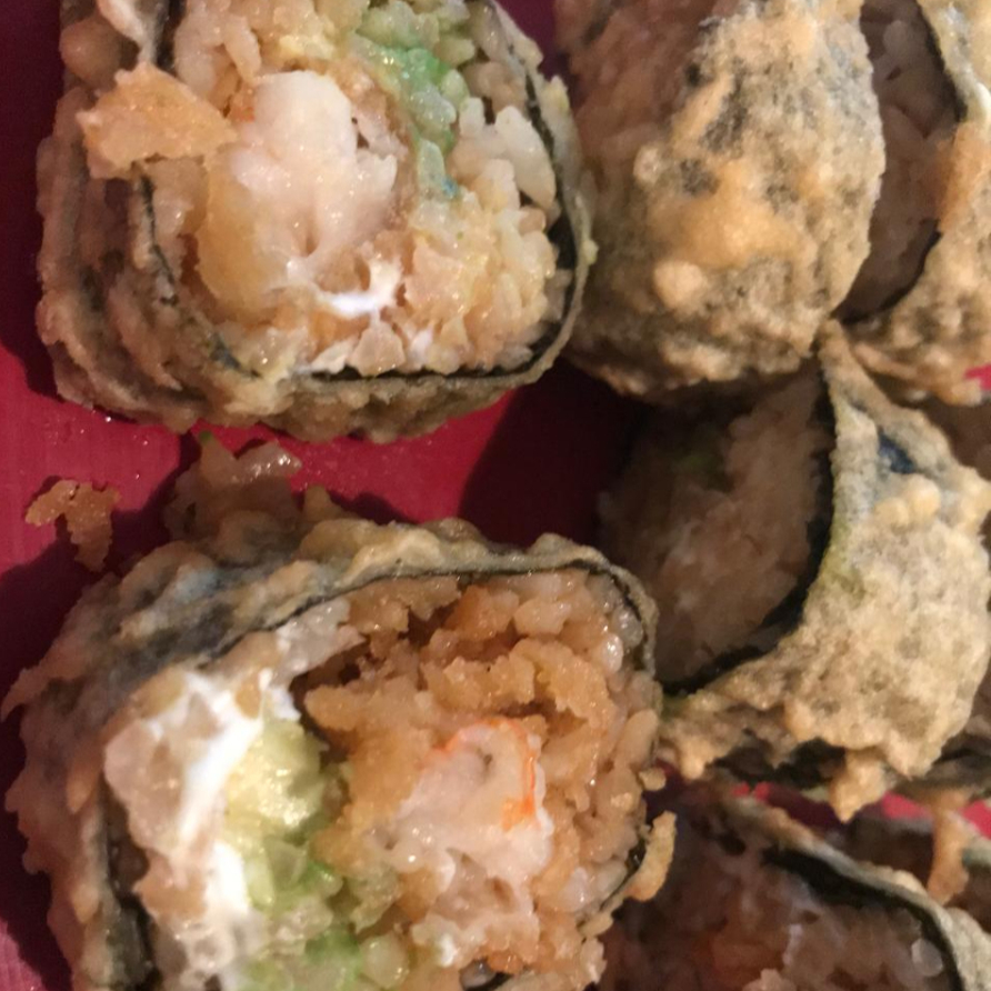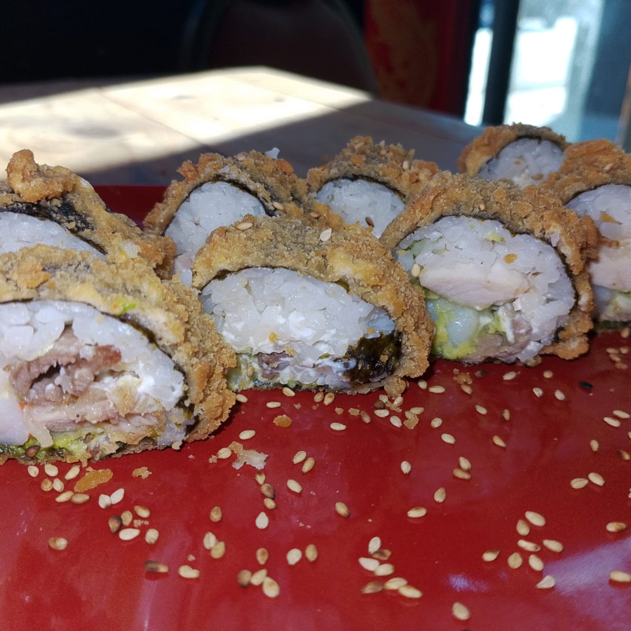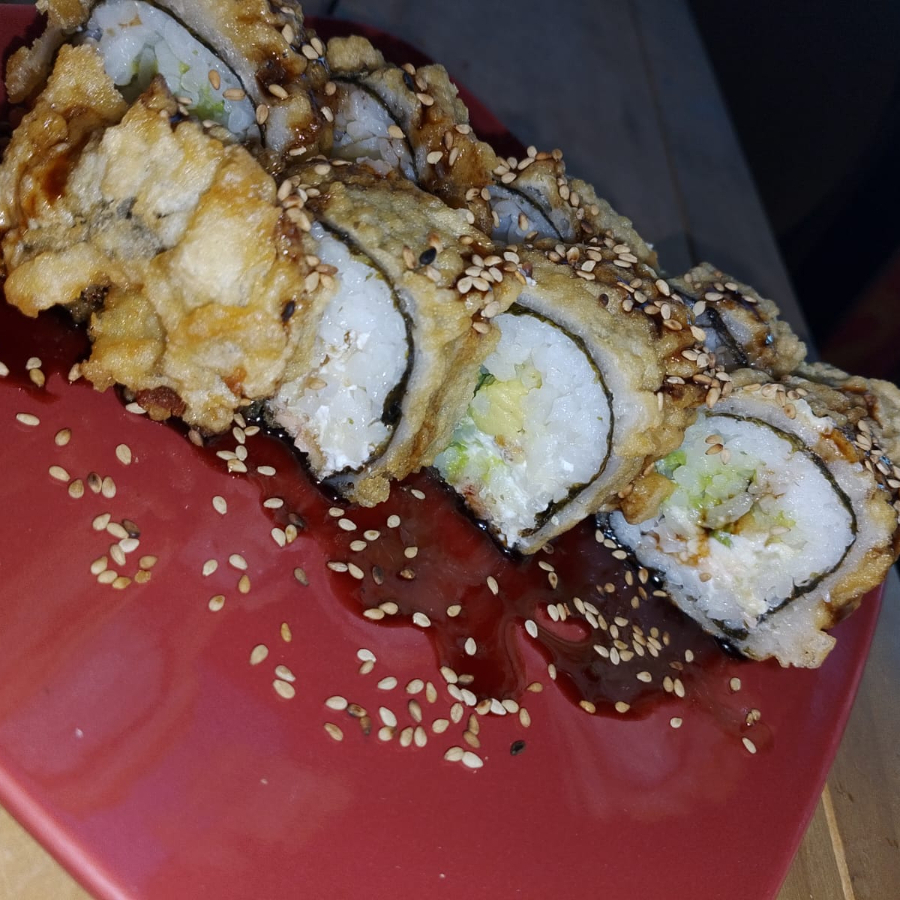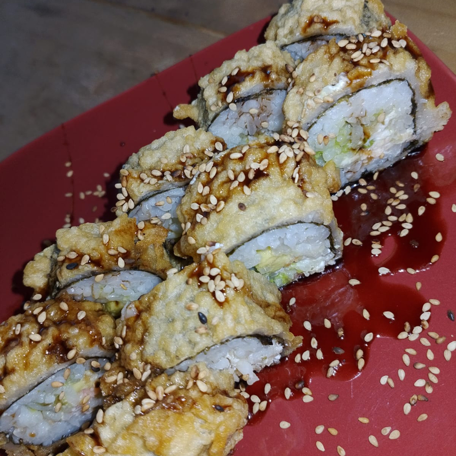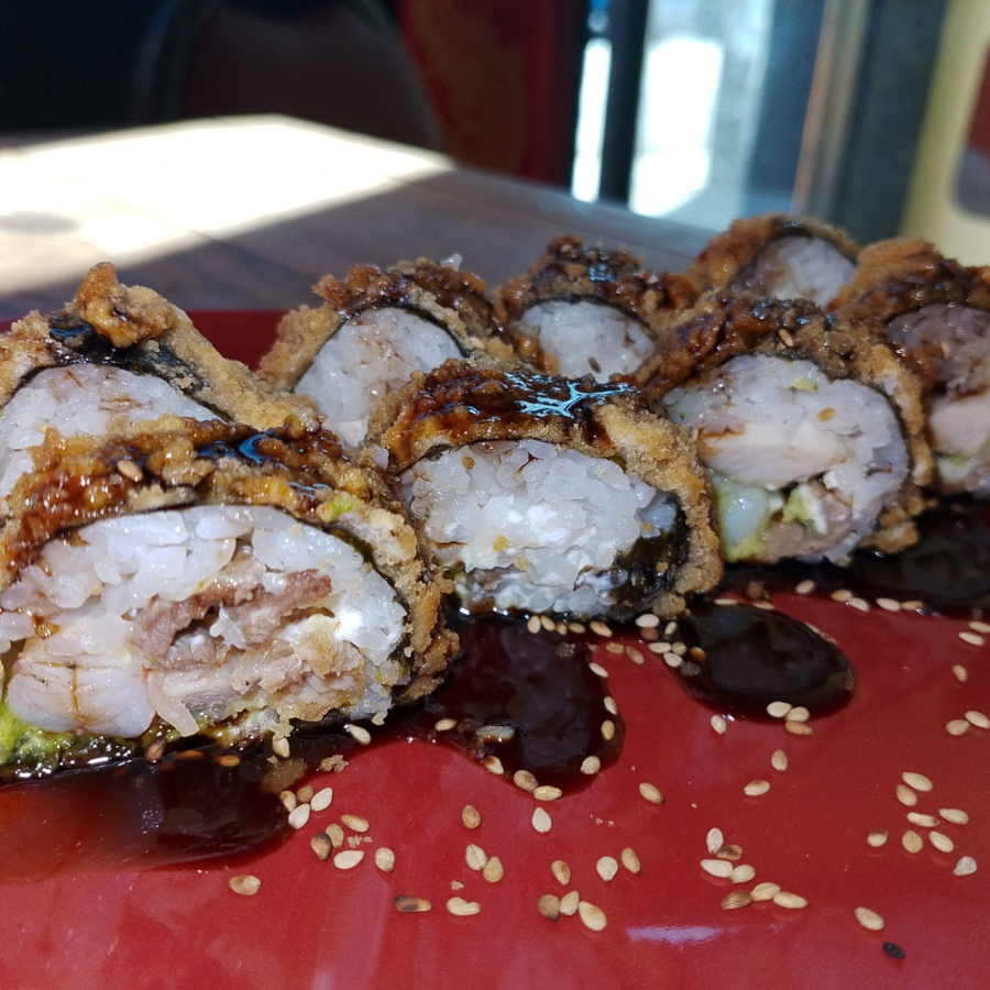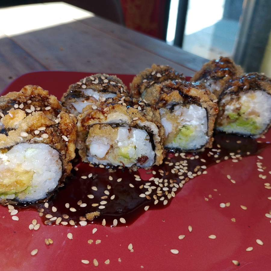 Arroz frito, camarón empanizado, queso crema, aguacate y salsa de anguila
