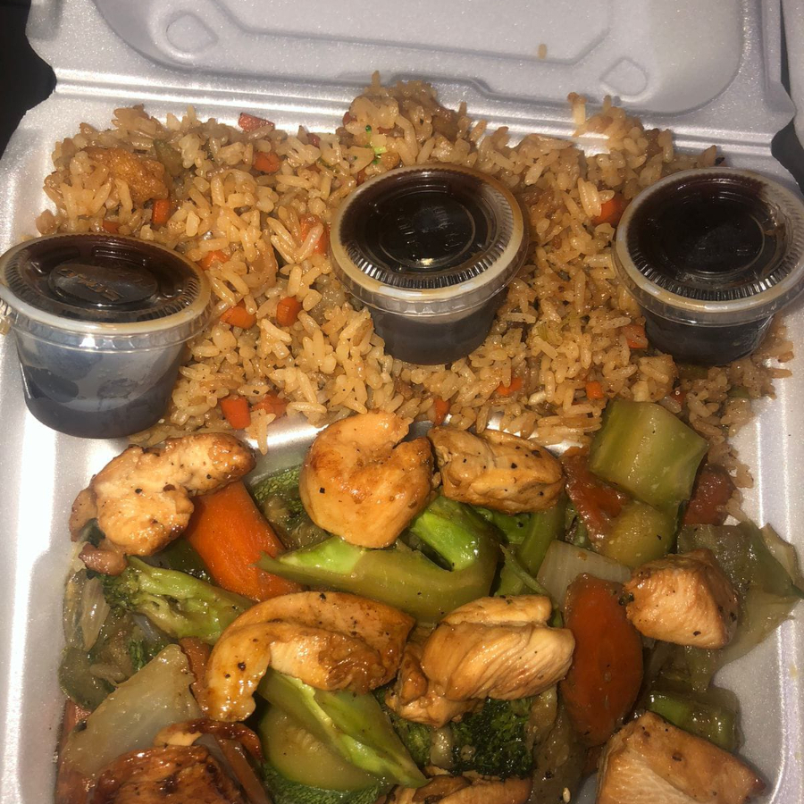 Arroz frito, pollo, carne, camarón, zanahoria y morrón