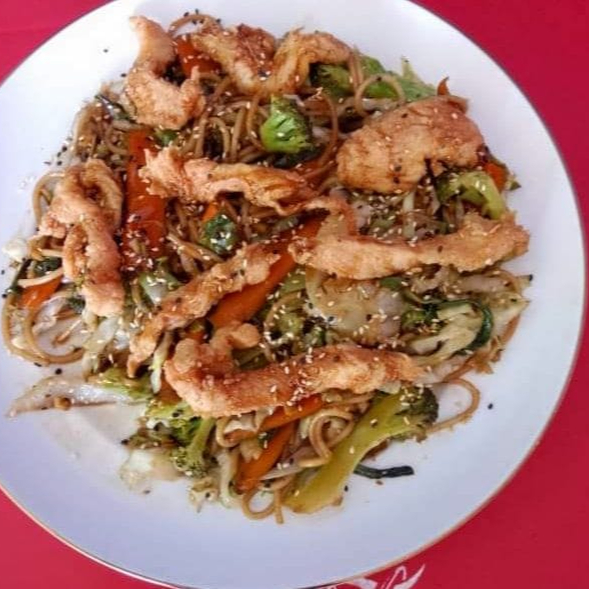 Fideos, pollo y verduras a la plancha con salsa yakisoba