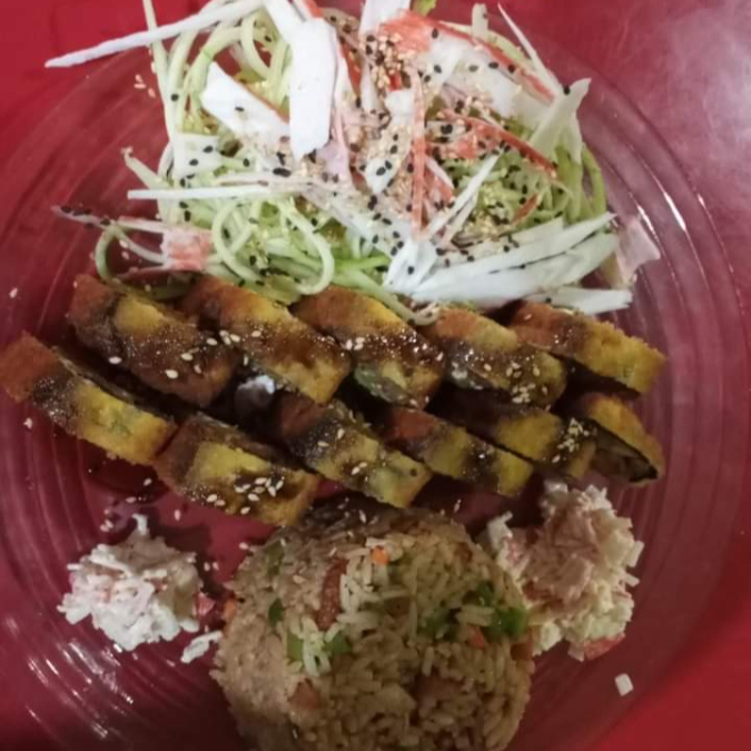 1 Bonsai Roll, 1/2 arroz frito y 1/2 sunomono de cangrejo