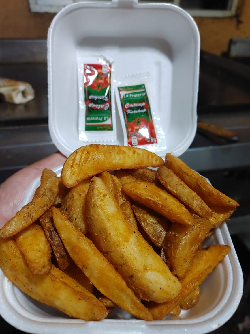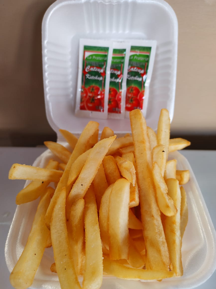Porción de papas fritas de 80 a 100g acompañadas de Catsup