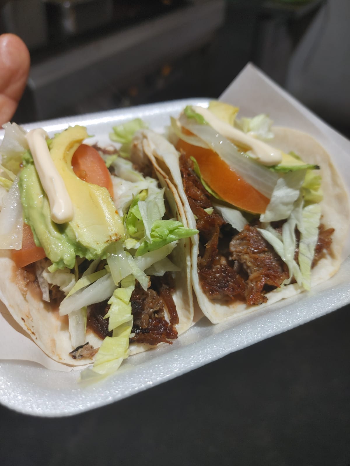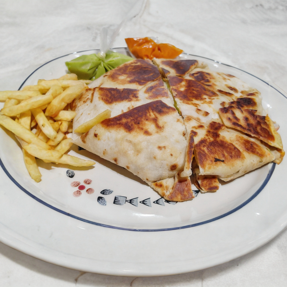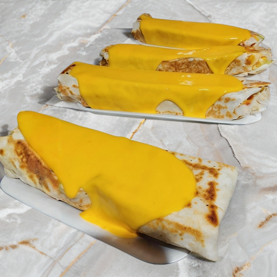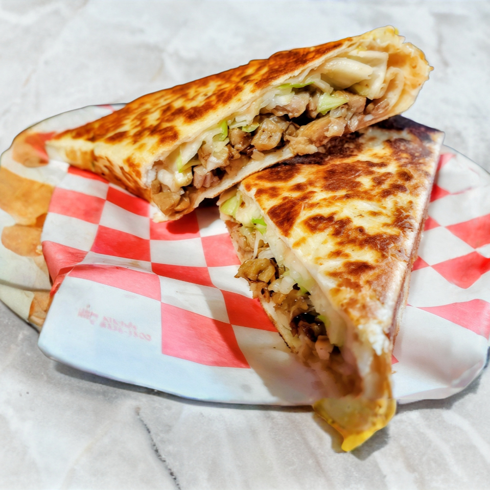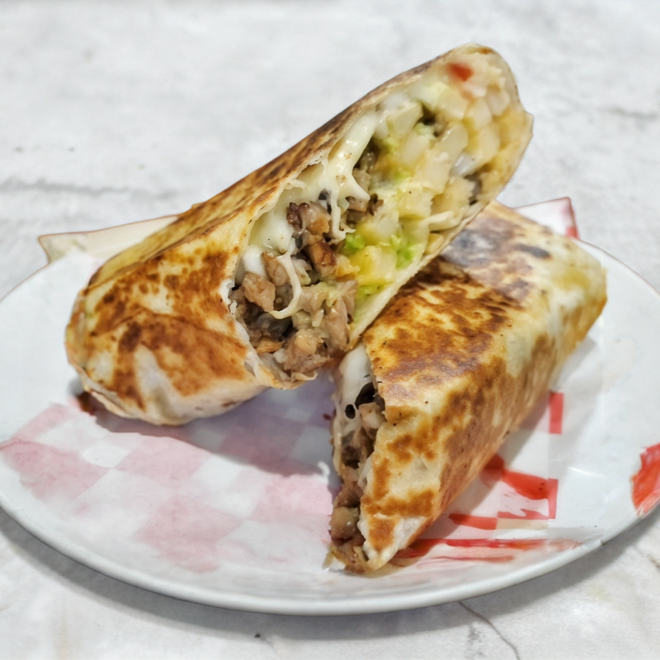 Tortilla doble de burrito preparada con queso mozarella carne a elegir,lechuga,tomate,cebolla,aguacate,mayonesa