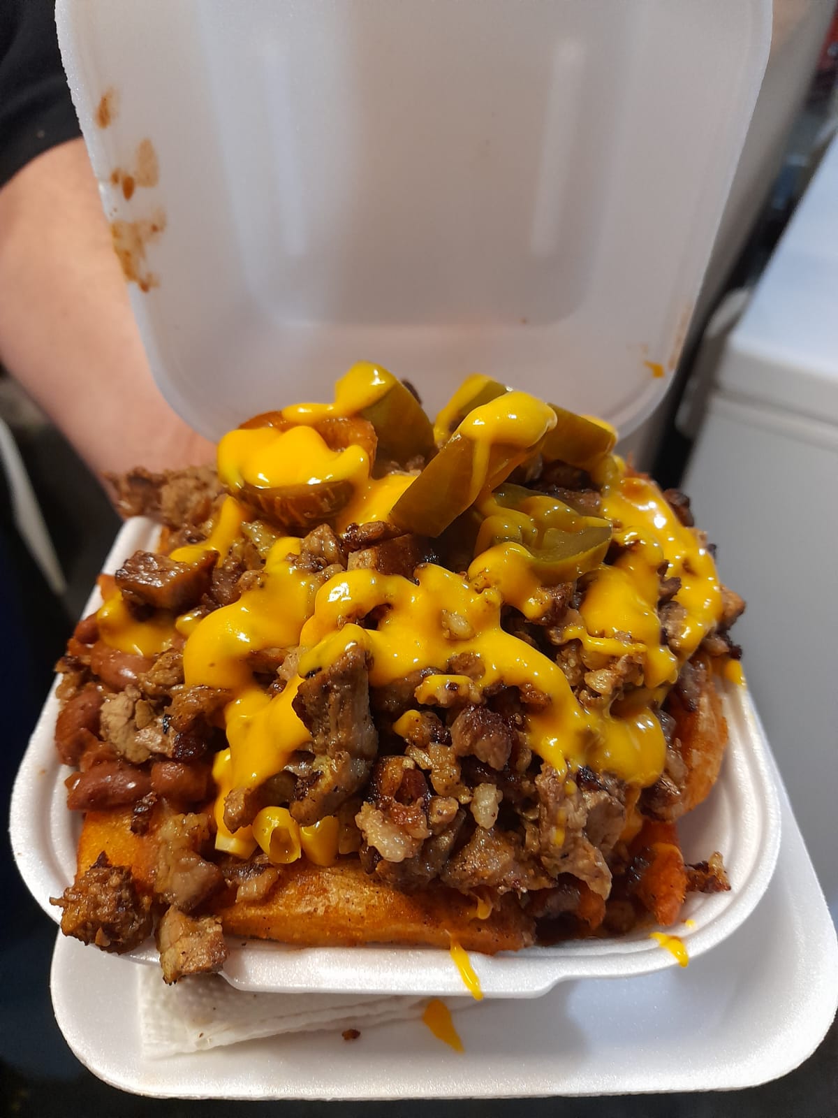Orden de Papas con carne, frijoles ranch, elote y jalapeño