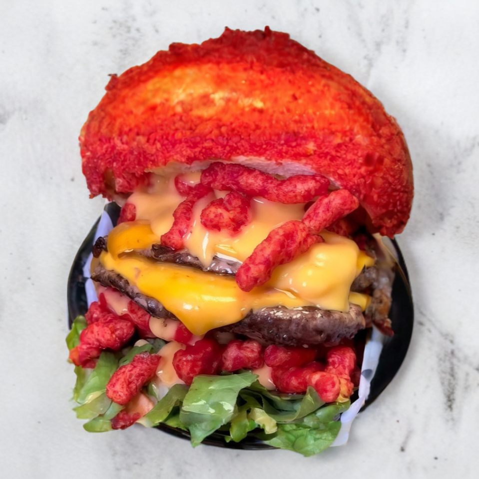 Hamburguesa de res con queso cheddar chetos flamin,lechuga,tomate,cebolla conporcion pequeña de papas.