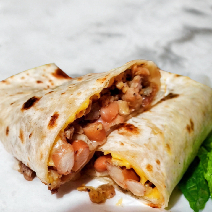 Burrito suave con frijoles en bola un toque de queso cheddar y carne de su eleccion