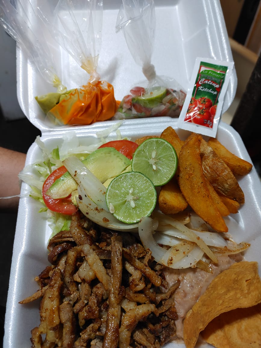 Orden de Carne Asada acompañada de ensalada de lechuga, Frijoles, Cebollitas Asadas, Papas Fritas, Limones y Salsas