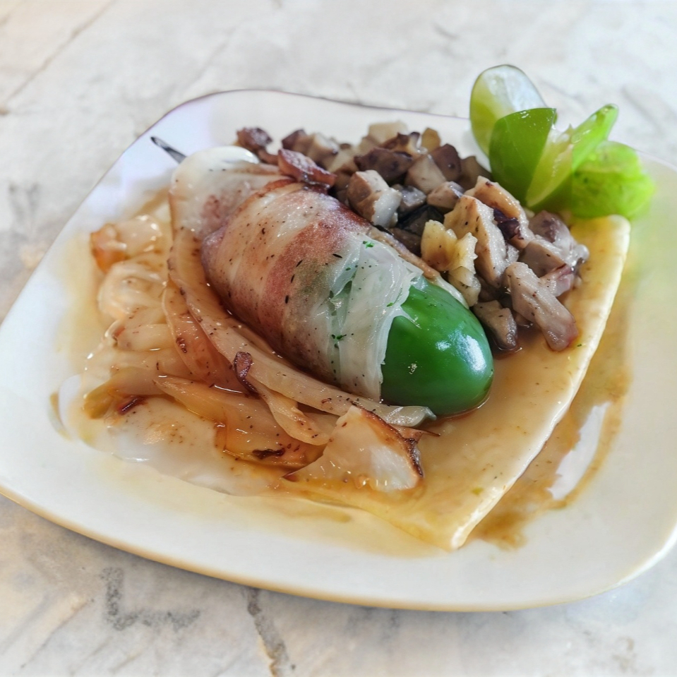 TACO CHILE TOREADO CON QUESO ASADERO ENVUELTO CON TOCINO ,CON CARNE ASADA CON SU GUARNICION DE CEBOLLA CARAMELISADA PICO DE GALLO SALSA Y LIMON.