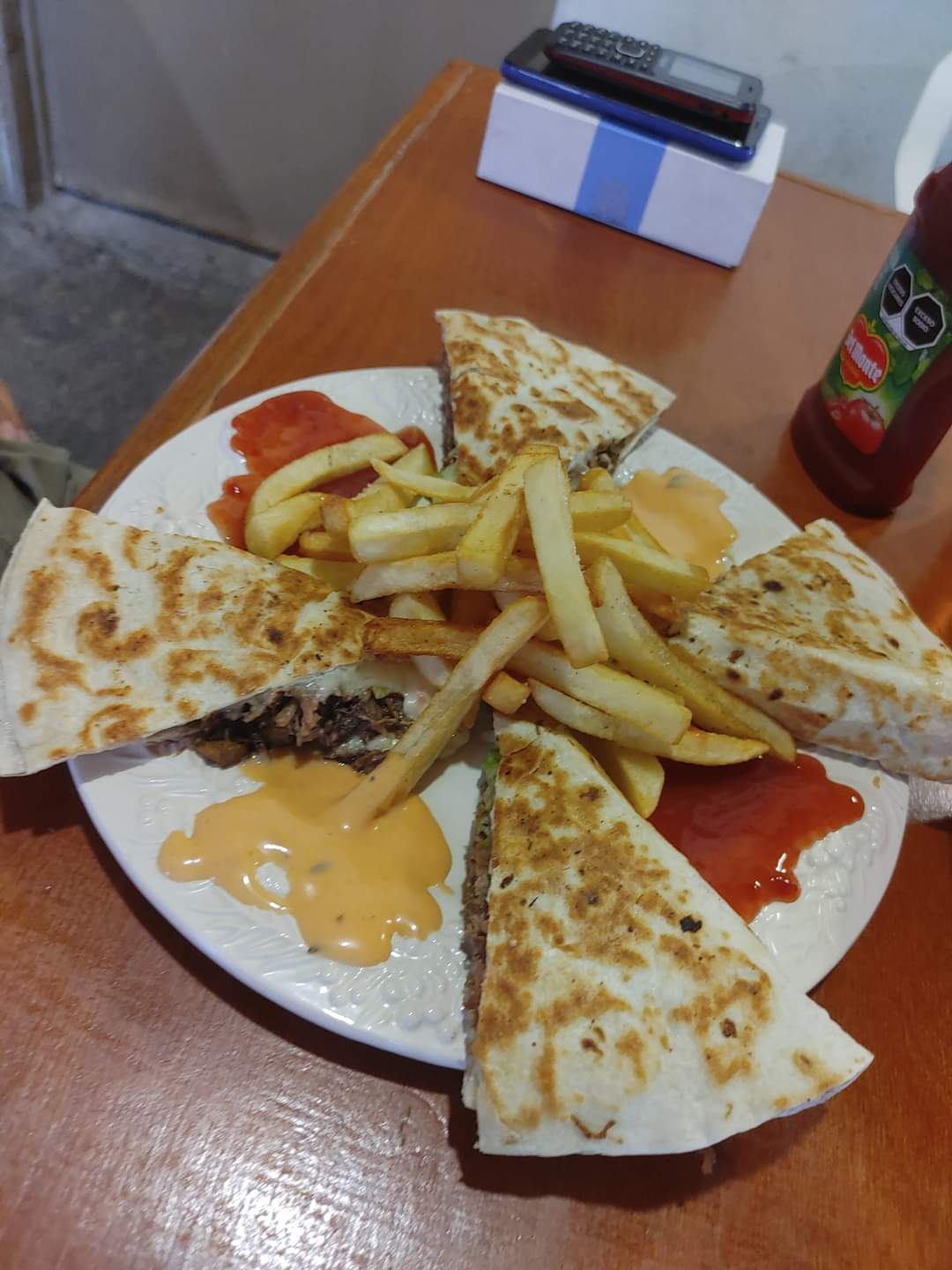 Tortillagrande,con queso asadero,carne a elegir,papas francesas,guacamole,pico de gallo y crema y bien doradito.