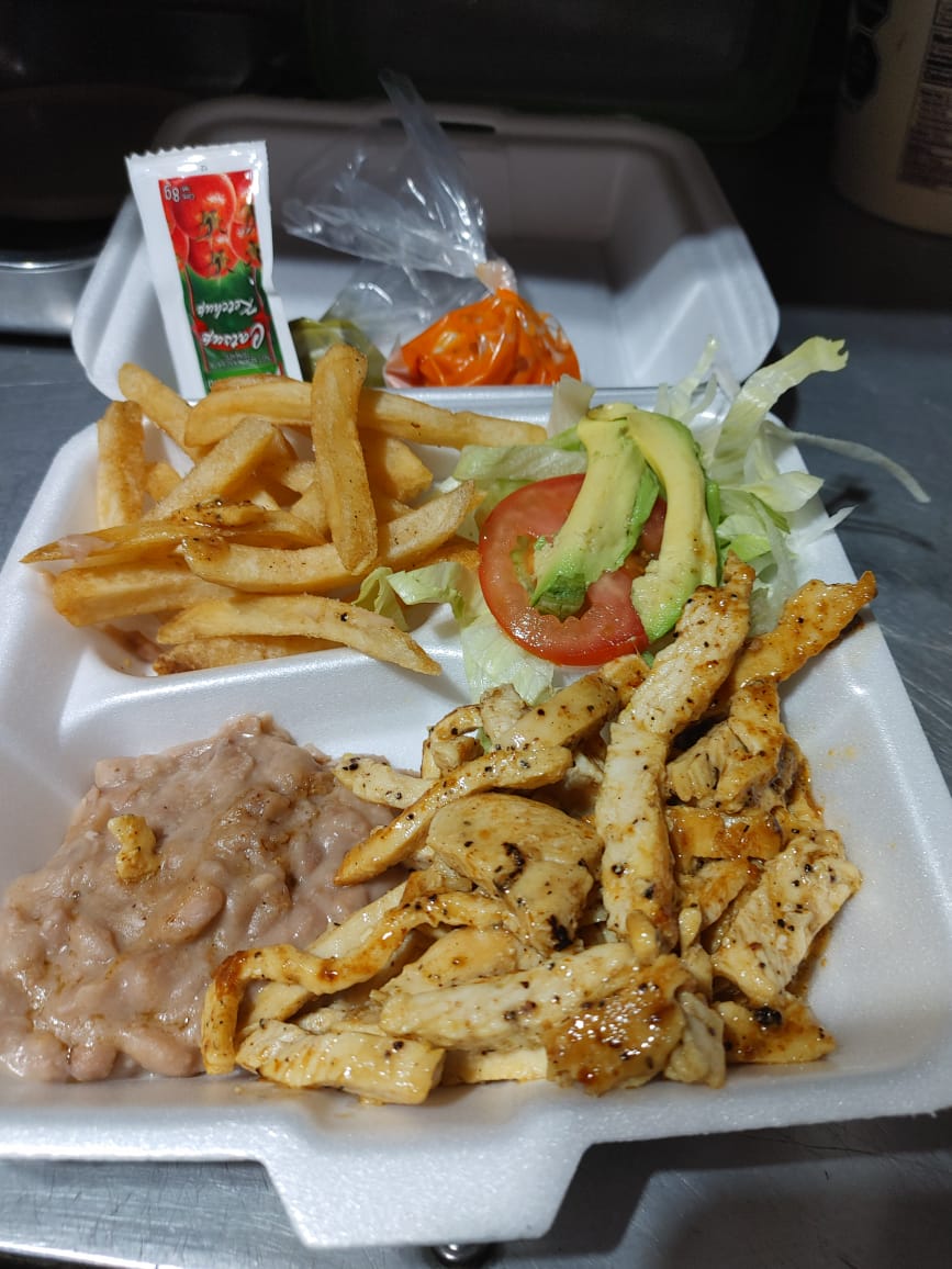 Platillo de Fajitas de Pollo a la plancha acompañadas de frijoles, ensalada de lechuga, cebollitas asadas, papas fritas y salsa